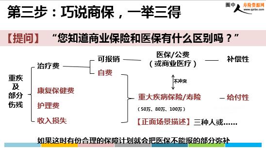 分析客户想法整理健康逻辑 朋友圈轻松宣传列名单客户分类 业绩取得源于—— 分析客户想法整理健康逻辑 人性的弱点 趋吉避凶:无视健康风险目光短浅:有医保就够了缺乏自控:消费先于缴费 保险就是对抗人性的弱点 分析客户想法 我的健康理念讲解思路 第一步:引出风险,切入保险第二步:重疾不远,尽早规划第三步:巧说商保,一举三得第四步:水到渠成,顺势而为 第一步:引出风险,切入保险 我的动作保险生活化 客户的想法我不需要保险 减压,卸下客户心里的负担 “HI,许久不见,最近新版重疾定义发布,您了解了吗?” “我今天的目的不是让你买保险,而是想跟你分享一些人生规划和风险管理的知识。也希望你听完后能给我提些建议,帮助我成长。” 第一步:引出风险,切入保险 工作——收入——提高生活品质 “完成人生责任的关键是要有持续的收入” 常备展业工具:保险法,自己的保单,人生责任图等等 第二步:重疾不远,尽早规划 我的动作由浅入深,把客户不愿面对的问题摆到客户面前,引发担忧 客户的想法不会轮到我离我还远 若客户觉得重疾离自己很远,从常见疾病切入 【提问】“好吧,假设我们不会得重大疾病。那您觉得高血压和糖尿病离我们很远吗?” 高血压糖尿病 终末期肾病心血管疾病脑血管疾病 意外 肢体缺失严重脑损伤严重烧伤瘫痪 第二步:重疾不远,尽早规划 第三步:巧说商保,一举三得 我的动作介绍商业保险功能、铺垫保额