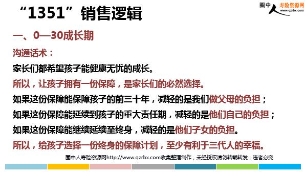 锁定目标应访尽访 完善家庭保障计划 锁定目标客户群体 重疾险新规过渡期,利用“xx理赔”向客户告知,结合情况,列出客户名单。 本月成交健康险:保额5580000 件数31件 那么问题来了:在锁定目标客户群体后,是什么样的原因和方法,让我给这么多客户完善保障计划,如何促成呢? “1351”法 锁定目标客户群体 1个图片画“人生” 3个数字引“风险” 5个提问做“决定” 1个计划保“周全” “1351”销售逻辑 “1351”开场切入话术: **女士/先生,之前咱们给孩子做了比较全面的保障计划(之前咱们为自己建立了百万医疗保障计划),是非常有规划意识的,作为您的风险规划师,我有义务帮您进行全方位的保障规划,那今天,我会就人生各个阶段的风险,为您做一个全面的分析,便于您今后逐步完善家庭的保障规划。 “1351”销售逻辑 1个图片画“人生” 3个数字引“风险” 三个数字均来源于大数据分析 “1351”销售逻辑 一、0—30成长期 沟通话术:家长们都希望孩子能健康无忧的成长。所以,让孩子拥有一份保障,是家长们的必然选择。如果这份保障能保障孩子的前三十年,减轻的是我们做父母的负担;如果这份保障能延续到孩子的重大责任期,减轻的是他们自己的负担;如果这份保障能继续延续至终身,减轻的是他们子女的负担。所以,给孩子选择一份终身的保障计划,至少有利于三代人的幸福。 “1351”销售逻辑