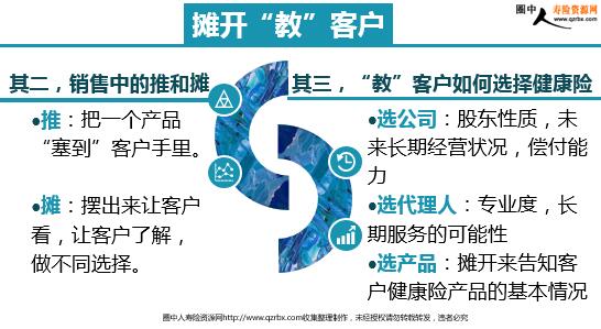 高额健康险销售逻辑 四问式销售 第一句:健康问题会不会发生,何时发生? 核心:谈现在和谈未来 沟通关键点: 四问式销售 越是在收入期,工作压力也越大,重疾就更容易发生,同时这个阶段生病也会对家庭影响更大;重疾不是眼前的风险,如果现在就有重疾肯定买不了保险; 现在购买重疾险,其实是为了重点解决未来5~10年的风险。 第二句:健康问题一旦发生需要多少花费? 核心:谈健康风险4大损失收入中断、终止;自费、医疗费用;必备的康复费用;家人陪护的收入损失、陪护费。 四问式销售 第三句:健康问题发生时,钱从哪里来? 四问式销售 核心:谈带薪休假 重疾险不仅能解决医疗费用,而且能充分利用财务杠杆弥补收入损失;买了足够多的重疾险,一旦生病,不仅可以安心治病,相当于带薪休假,甚至可以提前退休;案例讲解-讲身边的典型故事。第四句:钱重要还是命重要? 核心:谈保额设计考虑因素: ●经济条件、健康状态、现有医疗福利状况、家族健康史,以及重大疾病可能会中断收入的时间; ●至少5年以上年收入。 四问式销售 摊开“教”客户 其一,销售人员可能存在的问题 摊开“教”客户 总是在卖自己的卖点,而不是客户的买点典型情况: ●没有需求分析,直接进入产品 ●刻意改变客户想法,不会引导客户 ●去掉了客户在购买过程中最美好的东西——想象 摊开“教”客户 其四,观点引导:重疾和医疗的纠结问题 ●主推重疾,个人及客户利益最大;医疗险解决的是看得起病,能不能看的问题; ●重疾险解决的是看好病,不影响生活质量的问题; ●生病后安心治疗是最重要的。 摊开“教”客户