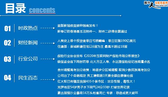 每日新闻速递 2021年3月31日 星期三 目录 时政热点 财经新闻 行业公司 民生百态 首版新冠疫苗接种指南发布! 新修订的香港基本法附件一、附件二获得全票通过 人类史上单个投资者单日亏损巅峰:单日狂抛190亿美元,市值蒸发330亿美元 住建部:县城新建住宅以6层为主 最高不超过18层 保险行业协会发布《2020年互联网财产保险市场分析报告》 银保监会连下两封罚单 北大方正人寿、永达理保险经纪违规遭点名 贵州调整高考加分政策:将逐步分区域调整 取消少数民族高考加分 公司出了个奇葩规定 员工请假超3天要全额自费缴社保 红火蚁已传播至我国435个县市区:攻击性强,毒性大! 克罗地亚54岁男子水下闭气24分33秒 打破世界纪录 蒙古国强沙尘暴致16万头牲畜死亡 专家:恐造成更大破坏 时政热点 首版新冠疫苗接种指南发布! 2021-03-29 15:18:38 来源:央视新闻 29日,国家卫健委发布《新冠病毒疫苗接种技术指南(第一版)》,针对既往感染者何时能接种新冠疫苗、18岁以下人群及孕期女性能否接种新冠疫苗等问题作出明确规定。 国家卫健委3月29日发布的首版新冠病毒疫苗接种技术指南最新明确,以下5类人群不宜接种疫苗:对疫苗的活性成分、任何一种非活性成分、生产工艺中使用的物质过敏者,或以前接种同类疫苗时出现过敏者;既往发生过疫苗严重过敏反应者(如急性过敏反应、血管神经性水肿、呼吸困难等);患有未控制的癫痫和其他严重神经系统疾病者(如横贯性脊髓炎、格林巴利综合症、脱髓鞘疾病等);正在发热者,或患急性疾病,或慢性疾病的急性发作期,或未控制的严重慢性病患者;妊娠期妇女。 新修订的香港基本法附件一、附件二获得全票通过 2021-03-30 10:15:54 来源:中央电视台 十三届全国人大常委会第二十七次会议30日上午在北京人民大会堂闭幕。会议经表决,全票通过新修订的《中华人民共和国香港特别行政区基本法附件一香港特别行政区行政长官的产生办法》、新修订的《中华人民共和国香港特别行政区基本法附件二香港特别行政区立法会的产生办法和表决程序》。国家主席习近平分别签署第75、76号主席令予以公布。栗战书委员长主持闭幕会。