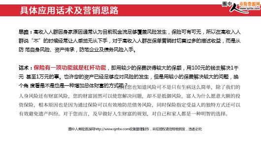 浅谈高收入人群的保险营销思路 对于高收入人群来说 高收入人群身家丰厚,但并不意味着抵御风险能力强,企业主本身生理 风险、投资风险、商业环境变迁可能都会对富人家庭以致命打击,现在有钱 真的不等于以后有钱,如何保证以后一直有钱,如何保证下一辈还有钱,下 下一辈还有钱,这都是富人要思考的,保险作为一种有效工具广泛的被高收 入人群所应用。 财富传承中常见的风险 人身风险意外或疾病身故导致家族财富发生继承纠纷,甚至落入外姓所有等 (姻亲大于血亲)婚姻风险个人面临婚变风险导致家族财富流失、公司经营出现混乱等税务风险(谨慎使用,中国目前无遗产税征收,建议应用客群为有遗产税征收国度的华侨等)面临遗产税、所得税等的高额缴纳,导致家庭财富缩水,无法顺利传承二代风险子女婚变或缺乏事业动力,快速挥霍导致家庭资产迅速流失债务风险企业经营出现风险,未做资产隔离,导致家庭资产被迫抵债思路:高收入人群因身家原因通常认为目前现金流足够覆盖风险发生,保险可有可无,所以在高收入人 群说“不”的时候经常让人感觉无从下手,对于高收入人群在保单营销时切莫过多的描述收益,而是从防 范自身风险、资产传承,防范企业及债务风险入手。 话术:保险有一项功能就是杠杆功能,即用较少的保费获得较大的保额,用100元的钱去解决1千元 甚至1万元的事。也许您的资产已经足够应对风险的发生,但是用较小的保费解决较大的问题,换个角 度看是不是也是一种增加总体财富的方式呢?