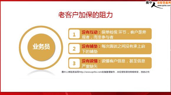 逻辑引领+精准发问流程+工具 层层深入突破老客户 老客户的定义: 所有购买过保险的客户(自己的或别人的) 保单检视? 老客户加保的阻力 业务员 客户 老客户加保的阻力 客户 买个安慰即可,不需要太多 原本买的就是人情,不会再买 明知保障不够、坚决不再买认同问题 老客户加保的阻力 业务员 没有互动:保单检视环节,客户是旁观者,而非参与者 没有铺垫:每次面谈之间没有承上启下的铺垫 没有读懂:读懂客户信息,甚至信息严重缺失 了解客户的基本信息 找到当前隐藏的风险 强调风险带来的后果 提供相应的解决方案 赢销四步法完美促成老客户加保 案例复盘 身份背景介绍: 林女士,40岁,全职太太, 15岁的儿子和4岁的女儿。 先生:外企高管 一家四口均只购买了重疾保险。 经过我的再次沟通,最后客户共成交重疾险保单4张,高端医疗4张,其他保险若干。 邀约前的准备 邀约方法 准备一 微信语音 电话 手书信函 有温度 的服务 林女士,您好: 不知不觉,我们认识快3年了, 很高兴通过小王的介绍让我们从陌生到熟悉,感谢你下定决心把你和全家的健康保障托付给我,这是对我最大的肯定和信任。