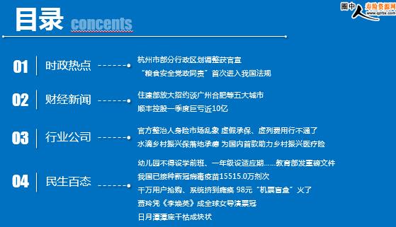 每日新闻速递 2021年4月10日 星期六 目录 时政热点 财经新闻 行业公司 民生百态 杭州市部分行政区划调整获官宣 “粮食安全党政同责”首次进入我国法规 住建部放大招约谈广州合肥等五大城市 顺丰控股一季度巨亏近10亿 官方整治人身险市场乱象 虚假承保、虚列费用行不通了 水滴乡村振兴保落地承德 为国内首款助力乡村振兴医疗险 幼儿园不得设学前班、一年级设适应期……教育部发重磅文件 我国已接种新冠病毒疫苗15515.0万剂次 千万用户抢购、系统挤到瘫痪 98元“机票盲盒”火了 贾玲凭《李焕英》成全球女导演票冠 日月潭潭底干枯成块状 时政热点 杭州市部分行政区划调整获官宣 2021-04-09 13:19:30 来源:一财网 临平区、钱塘区为新设立。 日前,浙江省人民政府发布《关于调整杭州市部分行政区划的通知》,根据通知,杭州市部分行政区划进行优化调整,撤销杭州市上城区、江干区,设立新的杭州市上城区;撤销杭州市下城区、拱墅区,设立新的杭州市拱墅区;撤销杭州市余杭区,设立新的杭州市余杭区。临平区、钱塘区为新设立。 “粮食安全党政同责”首次进入我国法规 2021/04/08 20:03:46 来源:新华网 修订后的《粮食流通管理条例》将自2021年4月15日起施行,“粮食安全党政同责”第一次在行政法规中得以明确规定。 国家粮食和物资储备局副局长黄炜8日在国务院新闻办公室举行国务院政策例行吹风会上说,粮食流通是连接粮食生产和消费的重要工作。近几年我国每年生产粮食超过1.3万亿斤,其中70%进入流通环节,超过9200亿斤。从一定意义上说,没有有效的粮食流通,就不会有真正的粮食安全。修订的条例按照党中央“粮食安全要实行党政同责,‘米袋子’省长要负责,书记也要负责”的最新要求,在全面总结粮食安全省长责任制做法经验的基础上,第一次在行政法规中明确规定省、自治区、直辖市应当落实粮食安全党政同责,完善粮食安全省长责任制,承担保障本行政区域粮食安全的主体责任。同时,对有关职能部门粮食流通监管职责作出了进一步明确和细化。