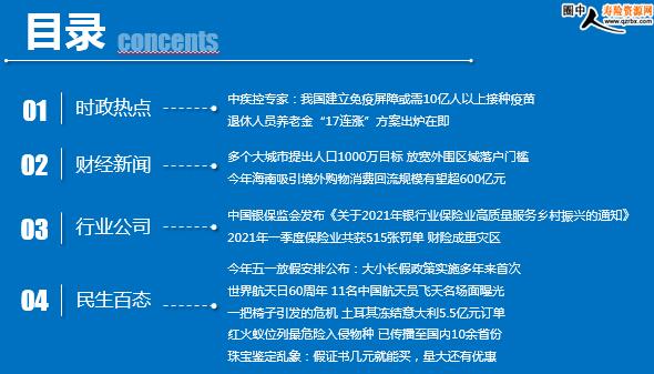 每日新闻速递 2021年4月13日 星期二 目录 时政热点 财经新闻 行业公司 民生百态 中疾控专家:我国建立免疫屏障或需10亿人以上接种疫苗 退休人员养老金“17连涨”方案出炉在即 多个大城市提出人口1000万目标 放宽外围区域落户门槛 今年海南吸引境外购物消费回流规模有望超600亿元 中国银保监会发布《关于2021年银行业保险业高质量服务乡村振兴的通知》 2021年一季度保险业共获515张罚单 财险成重灾区 今年五一放假安排公布:大小长假政策实施多年来首次 世界航天日60周年 11名中国航天员飞天名场面曝光 一把椅子引发的危机 土耳其冻结意大利5.5亿元订单 红火蚁位列最危险入侵物种 已传播至国内10余省份 珠宝鉴定乱象:假证书几元就能买,量大还有优惠 时政热点 中疾控专家:我国建立免疫屏障或需10亿人以上接种疫苗 2021.04.12 09:10:31 来源: 快科技 从3月24日起,中国启动新冠疫苗接种数据的日报制度,国家卫健委每日在官网公布疫苗接种总数,这也是人类疫苗接种史上首次启动国家级最大规模的日报制度。 中国疾控中心免疫规划首席专家王华庆:我们国家要建立免疫屏障,可能需要10亿人以上接种新冠疫苗,接种率越高,免疫屏障形成就越牢固,接下来我们还有一段路要走。 退休人员养老金“17连涨”方案出炉在即 2021/04/12 10:03:46 来源:新华网 2021年养老金上调窗口将开启。《经济参考报》记者获悉,我国城镇退休人员养老金即将迎来“17连涨”,具体上调方案正在酝酿,有望于本月内出台。同时,城乡居民养老金待遇也有望上调,不少地方已在紧锣密鼓推进。养老保险制度改革提速推进的信号也在密集释放,养老保险全国统筹箭在弦上,个人养老金制度也在研究制定中。 截至2020年,我国退休人员养老金已经实现“16连涨”。