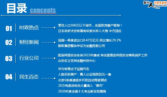 每日新闻速递 2021年4月14日 星期三 目录 时政热点 财经新闻 行业公司 民生百态 常住人口300万以下城市,全面取消落户限制! 日本政府决定将福岛核废水排入大海 中方回应 我国一季度进出口8.47万亿元 同比增长29.2% 蚂蚁集团整体申设为金融控股公司 医保网络安全体系2022年建成 将全面推进网络安全等级保护工作 众安设立亚洲金融科技中心 华为将推出子品牌汽车 人脸识别黑产:真人认证视频百元一套 北京6条高速逐步开放自动驾驶测试 20万吨退役电池大量流入“黑市” 2020年度全国十大考古新发现揭晓 时政热点 常住人口300万以下城市,全面取消落户限制! 2021.04.13 09:10:31 来源:中国经济网 国家发展改革委关于印发《2021年新型城镇化和城乡融合发展重点任务》的通知近日正式发布,其中明确,城区常住人口300万以下城市落实全面取消落户限制政策,实行积分落户政策的城市确保社保缴纳年限和居住年限分数占主要比例。城市落户政策要对租购房者同等对待,允许租房常住人口在公共户口落户。 日本政府决定将福岛核废水排入大海 中方回应 2021/04/13 10:03:46 来源:环球网 4月13日,日本政府决定以海洋排放方式处置福岛核电站事故核废水。作为日本近邻和利益攸关方,中方对此表示严重关切。 海洋是人类共同财产。福岛核电站事故核废水处置问题不只是日本国内问题。我们强烈敦促日方认清自身责任,秉持科学态度,履行国际义务,对国际社会、周边国家以及本国国民的严重关切作出应有回应。重新审视福岛核电站核废水处置问题,在同各利益攸关国家和国际原子能机构充分协商并达成一致前,不得擅自启动排海。中方将继续同国际社会一道密切关注事态发展,并保留作出进一步反应的权利。