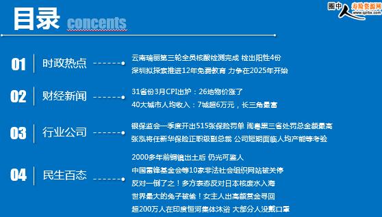 每日新闻速递 2021年4月15日 星期四 目录 时政热点 财经新闻 行业公司 民生百态 云南瑞丽第三轮全员核酸检测完成 检出阳性4份 深圳拟探索推进12年免费教育 力争在2025年开始 31省份3月CPI出炉:26地物价涨了 40大城市人均收入:7城超6万元,长三角最富 银保监会一季度开出515张保险罚单 闽粤黑三省处罚总金额最高 张泓将任新华保险正职级副总裁 公司短期面临人均产能等考验 2000多年前铜镜出土后 仍光可鉴人 中国雷锋基金会等10家非法社会组织网站被关停 反对一倒了之!多方表态反对日本核废水入海 世界最大的兔子被偷!女主人出高额赏金寻回 超200万人在印度恒河集体沐浴 大部分人没戴口罩 时政热点 云南瑞丽第三轮全员核酸检测完成 检出阳性4份 2021.04.14 09:10:31 来源:新京报 据央视新闻客户端消息,记者从瑞丽市疫情防控工作指挥部获悉,截至4月13日20时,瑞丽市第三轮全员核酸检测全部结束,共采样并检测381163份,检出阳性4份。 据瑞丽市疫情防控专家组介绍,一方面,瑞丽市第三轮全员核酸检测检出的阳性人员比第二轮有明显下降,说明这段时间采取的严格防控措施对遏制疫情扩散蔓延发挥了积极作用,疫情防控呈现持续向好态势;另一方面,第三轮核酸检测还检测出阳性人员,主要原因是病毒的潜伏期长短不一,需要多次检测才能发现。从启动第一轮全员核酸检测至4月13日刚好是14天时间,在14天的病毒潜伏周期内检出阳性人员属正常情况。 深圳拟探索推进12年免费教育 力争在2025年开始 2021/04/14 10:03:46 来源:环球网 2021年3月,两会期间,“建议率先在原深度贫困地区逐步普及十二年义务教育延伸至高中”等两会教育提议,成为2021热点话题。我国教育发展将面临巨大变革。 据深圳特区报13日报道,深圳打造民生幸福标杆不断有创新之举。根据深圳市教育局给市人大代表的建议答复,深圳将探索实施免费教育在当前九年制义务教育的基础上向两头延伸,力争到2025年逐步推进十二年免费教育。