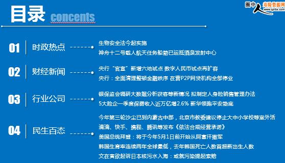 每日新闻速递 2021年4月16日 星期五 目录 时政热点 财经新闻 行业公司 民生百态 生物安全法今起实施 神舟十二号载人航天任务船箭已运抵酒泉发射中心 央行“官宣”新增六地试点 数字人民币试点再扩容 央行:全面清理整顿金融秩序 在营P2P网贷机构全部停业 银保监会调研大数据分析获客等新情况 拟制定人身险销售管理办法 5大险企一季度保费收入近万亿增2.6% 新华领跑平安垫底 今年第三轮沙尘已到内蒙古中部,北京市教委建议停止大中小学校等室外活 滴滴、快手、携程、腾讯等发布《依法合规经营承诺》 美国总统拜登:将于今年5月1日前开始从阿富汗撤军 韩国生育率连续两年全球最低,去年韩国死亡人数首超新出生人数 文在寅欲起诉日本核污水入海:或就污染提起索赔 时政热点 生物安全法今起实施 2021.04.15 09:10:31 来源:每日经济新闻 4月15日,今起,《中华人民共和国生物安全法》正式实施。通过运输、邮寄、携带危险生物因子入境的,依法追究法律责任;不得擅自引进释放丢弃外来物种;国家建立传染病、动植物疫情防控国际合作网络,尽早发现、控制重大新发突发传染病。 神舟十二号载人航天任务船箭已运抵酒泉发射中心 2021/04/15 10:03:46 来源:北京日报 据中国载人航天工程办公室消息,执行神舟十二号载人航天飞行任务的载人飞船及长征二号F遥十二运载火箭完成出厂前所有研制工作,日前,已分批安全运抵酒泉卫星发射中心,开展发射场区总装和测试工作。 目前,发射场设施设备状态良好,参试各系统正在有序开展各项任务准备,执行本次载人航天飞行任务的航天员乘组正在进行强化训练。