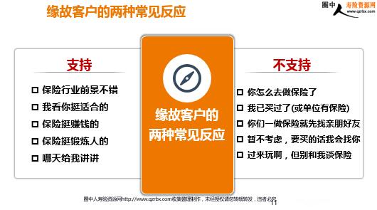 缘故客户的约访与面谈流程 他们会有什么反应? 想一想 如果现在给自己的P30客户打电话告诉他们你从事保险工作了 课程概述 课程目标 课程结构 1.寿险生涯从缘故开始(15分钟) 2.缘故销售的心理特征分析(15分钟) 3.缘故客户约访与面谈流程(60分钟) 1.了解开拓缘故客户的意义和缘故销售的心理特征 2.学习并掌握缘故客户的约访与面谈流程 缘故客户约访与面谈流程 寿险生涯从缘故开始 缘故销售的心理特征分析 寿险生涯从缘故开始 如果亲朋好友得了重病,你会做些什么? 陪伴就是治愈提供实际帮助 ......我们的职责—— 让身边的每一个人在风险来临时都能做好万全的准备让爱我的人和我爱的人都能拥有足够的保障 人人需要保险,缘故也不例外 缘故客户与其他客户的区别 缘故销售的心理特征分析 缘故客户的两种常见反应 支持 不支持 缘故客户的两种常见反应 保险行业前景不错我看你挺适合的保险挺赚钱的保险挺锻炼人的哪天给我讲讲 你怎么去做保险了我已买过了(或单位有保险) 你们一做保险就先找亲朋好友暂不考虑,要买的话我会找你过来玩啊,但别和我谈保险 最好的结果:20人都支持最坏的结果:20人都不支持 实际经验中,不支持的人通常会多于支持的人 要么成为你的贵人要么就成为伤害你最深的人 缘故客户 缘故客户反对的表象与实质