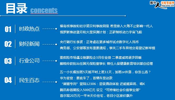 每日新闻速递 2021年4月20日 星期二 目录 时政热点 财经新闻 行业公司 民生百态 福岛核事故和切尔诺贝利事故同级 若是排入大海不止影响一代人 俄罗斯推进登月和火星探测计划:正研制核动力宇宙飞船,2030年实现宇航员登月 央行副行长李波:正考虑在更多城市试点数字化人民币 商务部、公安部等发布重要通知,事关二手车异地交易登记新举措 重疾险市场遇冷拖累险企3月份业绩 二季度或将逐步回暖 蔡皖伶获批出任国元保险董事长 曾任人保健康教育培训部总经理 五一小长假加班5天抵平时上班11天,加班or休息,你怎么选? 华为官宣:要卖车了,首辆车是这款 “熊猫专列”登陆12306:星级酒店体验 还能搓麻将、唱K 腾讯称首期投入500亿元 设立“可持续社会价值事业部” 首尔现20万元一平米天价住宅,老旧小区房价飙升 时政热点 福岛核事故和切尔诺贝利事故同级 若是排入大海不止影响一代人 2021.04.19 09:10:31 来源:千龙网 这场“核”水之患,始于2011年3月11日的日本9.0级特大地震,地震造成福岛第一核电站灾难性核泄漏,严重程度和“切尔诺贝利”是同一级别。经10年积累,核污染水量已达至少125万吨。若排放,57天可废掉半个太平洋,10年就蔓延全球海域…… 日本《朝日新闻》曾报道,其他国家正常运转的核电站在控制氚含量的前提下,将核废水排放入海。但事实是,福岛第一核电站的核污水所含放射性物质成分极其复杂,与普通核电站废水不可同日而语。首都医科大学吴巍教授介绍说,核废料中含有铯、锶、氚、钴、碘等多种放射性同位素,半衰期从十几年到几千年不等。以目前的核处理手段,很难达到日本所说的排放标准。 俄罗斯推进登月和火星探测计划:正研制核动力宇宙飞船,2030年实现宇航员登月 2021年04月19日 13:25:00 来源:每日经济新闻 央视新闻消息,当地时间18日,据俄罗斯第一频道报道,俄罗斯在总统普京主持的工作会议上讨论了实施登月和火星探测的国家计划。 据介绍,为了实现这些计划,俄罗斯正在研制由核动力推进的宇宙飞船,这一项目已经从2010年开始启动,其中部分技术已经获得突破。这种核动力推进器被命名为“宙斯”,项目投资额为42亿卢布,预计于2024年前完成研究。除了登月计划外,该推进器还计划用于金星和木星探测项目。此外,俄罗斯还将于2021年发射名为“月球-25”的月球探测器,上一次该国发射月球探测器为1976年,当时苏联发射了“月球-24”探测器。“月球-25”月球探测器计划于2021年10月1日从东方航天发射场发射,预计10日后着陆月球表面。该探测器将首次对月球南半球进行月壤成分和月球表面大气成分等方面的研究。俄罗斯还将于2024年发射“月球-26”月球探测器,于2025年发射“月球-27”月球探测器,并于2030年实现宇航员登月计划。