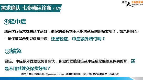 保险销售技巧邀约产品讲解及异议处理 01 邀约见面 02 理念沟通 03 产品讲解 04 异议处理 销售流程 邀约见面 亲,在**吗?您前几天不是给我在“我要上 封面活动”点赞了吗,公司准备了一系列20周年 纪念活动,相信您一定会喜欢的,我今天去给您介 绍一下。 专业的销售流程 理念沟通需求确认 健康保障理念七步确认诊断 理念沟通可采用最熟悉的内容,顺利承接到下一步的七步诊断环节 比如:三三法则、五指销售法、四大账户 理念沟通(1/2) 事后 大额信用工具+社保+医疗险+特药+重疾险 事中 事前 理念沟通(2/2)理念沟通-健康保障黄金公式 健康保障黄金公式让客户知道 为什么买、怎么买 可直接讲解产品了吗? “通过刚才的沟通,你觉得保障重要吗?你会考虑多少健康补充?多少意外补充?” 健康补充——弥补医疗缺口和因健康风险导致的财务损失 意外补充——责任额 责任额=负债(贷款)+10年生活费+孩子培养费+父母赡养费—存款 ①保障 你准备每个月拿多少出来做规划呢? 需求确认-七步确认诊断(1/5) “XX,您这么注重保养,平常身体一定很健康,我们先把一部分钱换个地方放,用来防范风险,你肯定希望一辈子健康的同时,这笔投入还可以拿回来,对吧?” 虽说现在疾病越来越年轻化,但人越到年纪大越容易生病,而年龄越大越买不到保险,那你希望买一份保险是保20年保到60岁还是保到80岁呢?