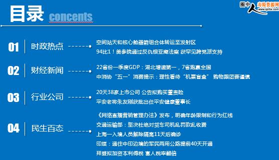 每日新闻速递 2021年4月24日 星期六 目录 时政热点 财经新闻 行业公司 民生百态 空间站天和核心舱器箭组合体转运至发射区 94比1!美参院通过反仇恨亚裔法案 获罕见跨党派支持 22省份一季度GDP:湖北增速第一,7省跑赢全国 中消协“五一”消费提示:理性看待“机票盲盒” 购物跟团要谨慎 20天38家上市公司 公告拟购买董责险 平安老将朱友刚获批出任平安健康董事长 《网络直播营销管理办法》发布,明确年龄限制和行为红线 交通运输部:坚决杜绝对货车司机乱罚款乱收费 上海一入境人员解除隔离11天后确诊 印媒:通往中印边境的军民两用公路提前40天开通 拜登拟加资本利得税 富人税率翻倍 时政热点 空间站天和核心舱器箭组合体转运至发射区 2021.04.23 09:10:31 来源:环球网 据中国载人航天工程办公室消息,4月23日,空间站天和核心舱与长征五号B遥二运载火箭组合体已转运至发射区,后续将按计划开展发射前的各项功能检查、联合测试等工作。目前,发射场设施设备状态良好,工程各参研参试单位正在全力备战。 94比1!美参院通过反仇恨亚裔法案 获罕见跨党派支持 2021-04-23 12:57 来源:中国新闻网 综合报道,当地时间22日,美国联邦参议员以94-1的表决结果,压倒性地通过了旨在解决针对亚裔仇恨犯罪的法案。民主及共和两党联合谴责疫情期间针对亚裔的暴力行为。