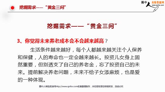 三三三讲终身寿险营销 挖掘需求——“黄金三问” 切入保险——“养老三要” 确认需求——“人生三保” 挖掘需求——“黄金三问” 1.你对“人的寿命是越来越长”这个观点怎么看? 基本事实: 2020年年末中国大陆总人口13.9亿。从年龄构成看: 16至59周岁人口为9.02亿,占总人口的64.9%;60周岁及以上人口2.4亿,占总人口的17.3%,其中,65周岁及以上人口1.5亿,占总人口的11.4%。 2、你是否担心“人活着,钱没了”的情况?养老最不确定的风险——不是钱,而是寿命的长短,活得太久,反而担心不知道养老金在哪里,怎么办?我们一直都在为两个自己在奋斗——年轻的自己和年老的自己;趁现在年轻,成本低,拿走以上担忧,完成未来养老心愿。这样做,我们自己会不会反对? 生活条件越来越好,每个人都越来越关注个人保养和保健,人的寿命也一定会越来越长。投资儿女身上固然重要,但别透支了自己的养老金,忘了投资自己的未来。提前解决养老问题,未来不给子女添麻烦,也是爱的一种体现。 3、你觉得未来养老成本会不会越来越高? 40岁以上的人都希望靠保养来保持自己的年轻容貌。担心衰老,愿意为活得年轻、活得自在、活得自信不断投入,高档化妆品、名牌服装、品牌首饰……,不惜用金钱换回年龄和自信。 40岁以上的人更希望通过保健拥有健康的体魄,才能长久享受生活。例如运动保健:高尔夫球、网球等;饮食保健:营养师量身定制保健食品;生活习惯:有规律、有节制、有计划。 人生二保”---第一保40岁以上的人必须要借助保险工具来规避风险,完成“人生三保”的心愿,缺一不可。未来不管有任何事情发生,只有保险可以让自己拥有更多的选择和主动。 第一要:持续 品质生活是“上得去、下不来”,未来自己能挣多少钱不重要,重要的是每一年有一个机构会在固定时间给你一笔钱,能够让你继续保养、保健,获得从容、美丽的人生。 把不确定的养老变为确定,从而获得内心的安宁和安全感。因为养老无忧,现有的资金才会得到释放,敢花、敢用、敢投资。