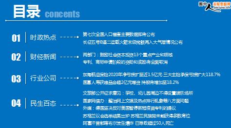 每日新闻速递 2021年5月10日 星期一 目录 时政热点 财经新闻 行业公司 民生百态 第七次全国人口普查主要数据即将公布 长征五号B遥二运载火箭末级残骸再入大气层情况公布 两部门:鼓励社会资本投资13个重点产业和领域 专利、商标申请阶段的资助和奖励将全面取消 东海航运保险2020年净亏损扩至近1.5亿元 三大主险承保亏损扩大118.7% 国富人寿获唯品会超2亿元增资 持股将增加至18.2% 文旅部公开征求意见:学校、幼儿园周边不得设置娱乐场所 国家网信办:整治网上文娱及热点排行乱象等八方面问题 外媒:德国坚决反对美国暂停新冠疫苗专利的提议 苏格兰议会选举结果出炉 苏格兰民族党未能获得多数席位 阿富汗首都喀布尔发生爆炸 已导致超过50人死亡 时政热点 第七次全国人口普查主要数据即将公布 2021-05-09 06:38:27 来源:每日经济新闻 国务院新闻办公室将于5月11日上午10时召开新闻发布会,介绍第七次全国人口普查主要数据结果。参加发布会的有国务院第七次全国人口普查领导小组副组长、国家统计局局长宁吉喆,国务院第七次全国人口普查领导小组办公室主任、国家统计局副局长李晓超,国务院第七次全国人口普查领导小组办公室副主任、国家统计局总统计师曾玉平,国务院第七次全国人口普查领导小组办公室副主任、国家统计局人口和就业统计司司长张毅。 长征五号B遥二运载火箭末级残骸再入大气层情况公布 2021-05-9 12:57 来源:新华社 据中国载人航天工程办公室发布,2021年5月9日7时24分,长征五号B遥二运载火箭末级残骸轨道为:近地点高度约130km,远地点高度约160km,倾角41.5°。预计再入时间为5月9日10时12分±15分钟,再入区域中心点位于东经28.38°,北纬34.43°。