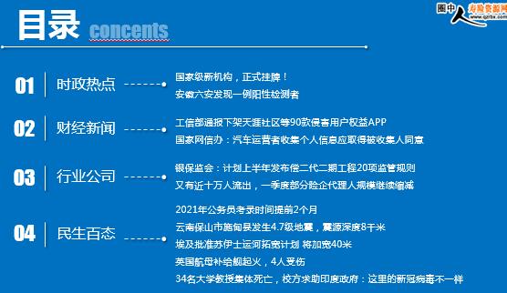 每日新闻速递 2021年5月14日 星期五 目录 时政热点 财经新闻 行业公司 民生百态 国家级新机构,正式挂牌! 安徽六安发现一例阳性检测者 工信部通报下架天涯社区等90款侵害用户权益APP 国家网信办:汽车运营者收集个人信息应取得被收集人同意 银保监会:计划上半年发布偿二代二期工程20项监管规则 又有近十万人流出,一季度部分险企代理人规模继续缩减 2021年公务员考录时间提前2个月 云南保山市施甸县发生4.7级地震,震源深度8千米 埃及批准苏伊士运河拓宽计划 将加宽40米 英国航母补给舰起火,4人受伤 34名大学教授集体死亡,校方求助印度政府:这里的新冠病毒不一样 时政热点 国家级新机构,正式挂牌! 2021-05-13 06:38:27 来源:北京晚报 2021年5月13日10时,北京市海淀区知春路14号,国家疾病预防控制局正式挂牌。国家疾病预防控制局成立,意味着疾控机构职能从单纯预防控制疾病向全面维护和促进全人群健康转变,新机构将承担制订传染病防控政策等五大职能。 安徽六安发现一例阳性检测者 2021-05-13 12:57 来源:北京日报 今日凌晨,六安世立医院在对就诊患者开展例行新冠病毒核酸检测时,发现一例呈阳性。裕安区疾控部门接报后立即开展送样复核、流调溯源、专家会诊研判等工作。目前复核结果和专家会诊诊断结果待出;各项应急处置措施已及时部署,正在推进落实中。后续将及时、如实通报流行病学调查进展及专家研判结果。