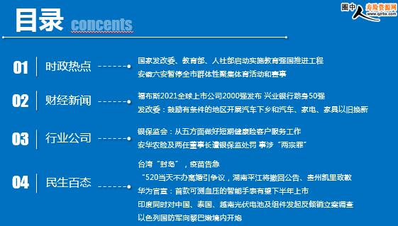 每日新闻速递 2021年5月19日 星期三 目录 时政热点 财经新闻 行业公司 民生百态 国家发改委、教育部、人社部启动实施教育强国推进工程 安徽六安暂停全市群体性聚集体育活动和赛事 福布斯2021全球上市公司2000强发布 兴业银行跻身50强 发改委:鼓励有条件的地区开展汽车下乡和汽车、家电、家具以旧换新 银保监会:从五方面做好短期健康险客户服务工作 安华农险及两任董事长遭银保监处罚 事涉“两宗罪” 台湾“封岛”,疫苗告急 “520当天不办离婚引争议,湖南平江将撤回公告、贵州凯里致歉 华为官宣:首款可测血压的智能手表有望下半年上市 印度同时对中国、泰国、越南光伏电池及组件发起反倾销立案调查 以色列国防军向黎巴嫩境内开炮 时政热点 国家发改委、教育部、人社部启动实施教育强国推进工程 2021-05-18 10:46:30 来源:海外网 据国家发展改革委公众号消息,国家发展改革委、教育部、人力资源社会保障部决定实施教育强国推进工程,并于近日印发《“十四五”时期教育强国推进工程实施方案》。 教育强国推进工程紧紧围绕基础教育、职业教育、高等教育三大板块,基础教育注重补短板,职业教育注重树精品,高等教育注重创一流。 安徽六安暂停全市群体性聚集体育活动和赛事 2021-05-18 12:57 来源:证券时报 记者从六安市政府了解到,为切实减少人员聚集和流动给疫情防控带来的风险,六安市教体局印发《关于严控体育活动和赛事等聚集性活动的通知》。《通知》要求:暂停全市群体性聚集体育活动和赛事。