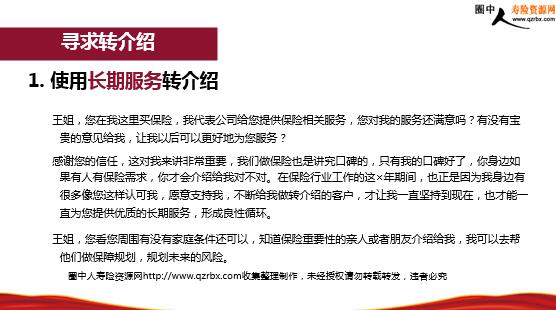 短期健康险转加保沟通逻辑异议处理及转介绍 分享1个故事转保操作 参与1个活动服务吸引 提供1次保单年检促成加保 沟通逻辑 异议处理 寻求转介绍 (一)送上1份“福利”,现场见面 为本次转保提前准备的拜访行销辅助品 开门见山以转保服务邀约,同时送“福利” 您好,X姐,我是xx,您今天下午在家/单位吗?是这样的,现在银保监 会针对短期健康险新出台了一个规范政策,这个政策和您原来在我这买的 保险有非常重要的关系,所以公司要求我们需要当面和您沟通,带来两个 政策消息,另外端午节快到了,也来问候下您,给您做个服务,您看我今 天下午过去方便吗? (二)带上2个消息,导入话题 今天给您带来两个消息:一个关于监管政策的消息,一个关于公 司政策的消息,您愿意先听哪一个? (无论客户如何回答,先从“政策消息”讲起,进而导入《中国银保监会办公厅关于规范短期健康保险业务有关问题的通知》【2021】7号) 《通知》聚焦行业短期健康保险业务发展中的突出问题,采取针对性的监管措施,《通知》的印发将有利于保护消费者合 法权益,有利于维护市场公平合理的竞争秩序,为健康保险业务可持续发展提供制度保障。做出了六点要求: (一)续保条款必须表述为“不保证续保条款”,且表述必须包含“本产品保险期间为一年(或不超过一年)。保险期间届满,投保人需要重新向保险公司申请投保本产品,并经保险人同意,交纳保险费,获得新的保险合同”。(二)条款中不得包含“本产品可续保至××周岁”“续保时最高年龄可至××周岁”等类似表述。 (三)条款中不得包含“您重新投保时,我们不会因为被保险人的健康状况变化或者理赔情况而拒绝您的投保申请”“您第× 次后投保时,我们不会因为被保险人的健康状况变化或者理赔情况而拒绝您的投保申请”或“我们不会因为被保险人在首次投保后的健康状况变化而拒绝您的重新投保申请”等类似表述。 (四)条款中不得包含“续保时我们将以您首次投保时的身体状况和健康告知进行核保”或“续保时我们不再对您的身体状况进行审核”等类似表述。 (五)条款中不得包含“续保时保费交纳宽限期为60天”等类似表述。 (六)条款中不得包含其他让消费者易混淆的,易发生“短险长做”风险的表述。