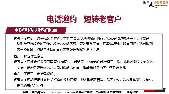 单兵拜访三步成交法 老客户(短转、无短转)&新客户 电话邀约 短转老客户非短转老客户新客户 面见讲解 短转信息告知行业政策梳理销售理念讲解 巧妙促成 推定承诺法富兰克林比较法利诱法激将法危机法 电话邀约---短转老客户 代理人:李姐,您是xx的老客户,有件事关系到您切身的利益,我需要和您沟通一下,那就是短期医疗险转换的事情。您作为xx的老客户真的非常幸福,在2021年4月30日前购买我司短期医疗险和附加短期医疗险的客户需要转换到新的衔接产品。 客户:那是什么意思? 代理人:正好我们公司回国复业20周年,我给每一个老客户都准备了一份小礼物感谢这么多年的 支持,我也需要给您送过去同时说明这件事,您看我们是约下午还是晚上呢? 客户:不用了,电话里说吧。 代理人:短期健康险转换关乎您的权益问题,电话里说不清楚,我下午过去给您具体讲讲,这也 是我的责任和义务、 用短转和礼物邀约见面 电话邀约---非短转老客户 代理人:陈姐,你好!今年是建党100周年,也是我们国家全民小康的实现之年,同时也是xx人寿境内复业x周年,为了践行“健康中国2030”理念,为全民健康助一份力,公司特在二季度推出健康关爱季活动,为了感谢您一直以来的支持,我特为每一位老客户准备了一份礼品,您看是今天下午1点还是2点更方便?我给您送过去。 客户:我下午正好没事,那先约2点吧。代理人:好,一会见。 用礼物邀约见面