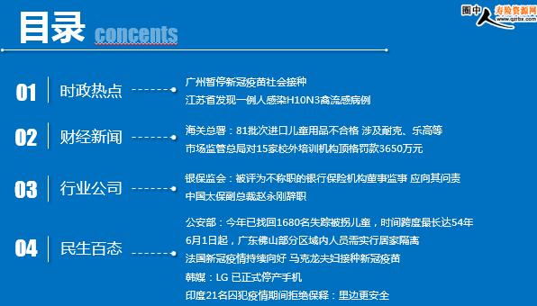 每日新闻速递 2021年6月2日 星期三 目录 时政热点 财经新闻 行业公司 民生百态 广州暂停新冠疫苗社会接种 江苏省发现一例人感染H10N3禽流感病例 海关总署:81批次进口儿童用品不合格 涉及耐克、乐高等 市场监管总局对15家校外培训机构顶格罚款3650万元 银保监会:被评为不称职的银行保险机构董事监事 应向其问责 中国太保副总裁赵永刚辞职 公安部:今年已找回1680名失踪被拐儿童,时间跨度最长达54年 6月1日起,广东佛山部分区域内人员需实行居家隔离 法国新冠疫情持续向好 马克龙夫妇接种新冠疫苗 韩媒:LG 已正式停产手机 印度21名囚犯疫情期间拒绝保释:里边更安全 时政热点 广州暂停新冠疫苗社会接种 2021-05-31 10:46:30 来源:每日经济新闻 5月31日17时30分,广州新闻发布会上,广州市人民政府副市长黎明介绍,为减少人员聚集可能带来的传播风险,根据不同类型的情况调整疫苗接种的节奏,广州于今年3月启动新冠病毒疫苗的大规模接种工作以来,截止到5月31日的16:00,全市已经累计接种了1313.66万剂次,1011.11万人,全市一共有325.22万人完成了全程免疫。“鉴于当前我市的疫情防控形势,需要集中精力和资源做好核酸检测,经过综合研判整体衡量,我们决定从即日起调整新冠疫苗的接种工作的节奏,近日先有序地安排重点行业、重点群体的团体预约和集体接种为主,暂缓个人预约,暂停新冠疫苗的社会接种。” 江苏省发现一例人感染H10N3禽流感病例 2021-06-01 14:08:19 来源:每日经济新闻 国家卫生健康委6月1日通报,江苏省发现一例人感染H10N3禽流感病例。 患者,男,41岁,现居江苏镇江。4月23日出现发热等症状,4月28日因病情加重收入当地医疗机构救治。目前,患者病情稳定,基本达到出院标准。5月28日,中国疾控中心对江苏省送来的患者标本开展全基因组序列测定,结果为H10N3病毒阳性。江苏省对所有密切接触者进行医学观察,在当地开展应急监测,均未发现异常情况。