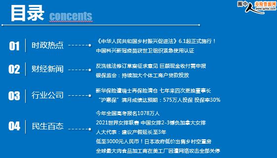 每日新闻速递 2021年6月3日 星期四 目录 时政热点 财经新闻 行业公司 民生百态 《中华人民共和国乡村振兴促进法》6.1起正式施行! 中国科兴新冠疫苗获世卫组织紧急使用认证 反洗钱法修订草案征求意见 巨额现金收付需申报 银保监会:持续加大个体工商户贷款投放 新华保险遭瑞士再保险清仓 七年来四次更换董事长 “沪惠保”满月成绩达预期:575万人投保 投保率30% 今年全国高考报名1078万人 2021世界女排联赛 中国女排2-3憾负加拿大女排 人大代表:建议产假延长至3年 低至3000元人民币!日本政府低价出售乡村空置房 全球最大肉食品加工商在美工厂因遭网络攻击全部关停,白宫又说“黑客可能来自俄罗斯” 时政热点 《中华人民共和国乡村振兴促进法》6.1起正式施行! 2021-06-01 10:46:30 来源:新华网 《中华人民共和国乡村振兴促进法》6月1日起正式施行。全国人大常委会5月27日在京举行乡村振兴促进法实施座谈会。全国人大农业与农村委员会、国家发展改革委、农业农村部等部委有关负责同志和基层干部代表在座谈会上发言,中央组织部、中央宣传部、最高人民法院、财政部等相关单位进行了书面交流。 中国科兴新冠疫苗获世卫组织紧急使用认证 2021-06-02 14:08:19 来源:新华社 世界卫生组织1日宣布,由中国北京科兴中维生物技术有限公司研发的新冠灭活疫苗“克尔来福”正式通过世卫组织紧急使用认证。 世卫组织总干事谭德塞当天在记者会上宣布,科兴新冠疫苗被证明是“安全、有效和有质量保证的”,已被列入世卫组织紧急使用清单。此外,该疫苗易于储存的特点使其非常适用于资源匮乏的环境。