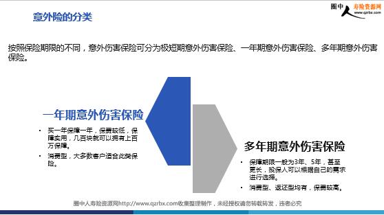 意外险基础知识与热卖意外险 学习目的 1、了解意外险的功用,进而掌握意外险的销售逻辑; 2、清楚一年期、多年期意外险产品形态。 意外险的定义及功用一年期意外伤害保险示例多年期意外伤害保险示例 意外险的定义及功用 “意外伤害”与“意外伤害保险” 意外伤害保险是以被保险人因遭受意外伤害造成死亡、残废为给付保险金条件的人身保险。意外伤害指外来的、突发的、非本意的、非疾病,导致的身体伤害。也就是说自杀、猝死、疾病等原因导致的身体伤害,都不属于意外伤害。常见的意外伤害 高空坠物 动物咬伤 溺水 煤气中毒 自然灾害 2017年12月31日,北京林业大学经济管理学院9名大四女生结伴乘坐面包车从哈尔滨前往雪乡途中,发生交通事故,造成4人死亡,5人受伤。 2014年3月8日00:42航班在马来西亚吉隆坡国际机场起飞,计划06:30在北京降落。01:20,航班在马来西亚和越南的交接处与胡志明管控区失去联系,且并未收到失踪飞机的求救信号。 当地时间2020年1月26日上午10时左右,科比在美国加利福尼亚州南部卡拉巴萨斯市发生的直升机坠毁事故中遇难,年仅41岁。其13岁的二女儿吉安娜也在事故中不幸去世。 哪种出行方式更安全? 2019年中国交通发生数量为24.8万起,同比增长1.1%,死亡人数为62763人,受伤人数为256101人。数据来源:中华人民共和国2019年国民经济和社会发展统计公报 根据2017年国家统计局显示数据:在我国每年非正常死亡人数超过320万,平均每天8767人死于意外事故,平均每分钟6人,每个人在一年中死亡的概率是2.4‰。人在家中平均每5秒就会发生1场意外伤害,每27分钟就有1人死于家庭意外事故(摔落、中毒、火灾、烧伤、割伤、骨折、窒息、溺水和触电等)。风险数据 面对可能突如其来的风险,我们要做些什么? 意外保障, 不单是为了保障自己, 更是对家人爱与责任。 正确面对风险,降低风险的伤害程度,这是每个人必须面对的课题。