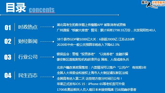 每日新闻速递 2021年6月9日 星期三 目录 时政热点 财经新闻 行业公司 民生百态 湖北高考生拍数学题上传搜题APP 被取消考试资格 广州通报“核酸大排查”情况:累计采样2798.55万份,共发现阳性40人 38个县市GDP破1000亿大关:6县超2000亿 江苏占16席 2020年中央一般公共预算非税收入下降62.3% 银保监会:警惕“投资养老”“以房养老”金融诈骗 雄安新区首批财险机构获准开业 国寿、人保成排头兵 北京户籍改革政策落地:六类情况可以落户“公共户” 有效期1年 全国人大常委会拟授权上海市人大制定浦东新区法规 全国高考进入第二天 这些地方查分时间已公布! 苹果正式发布iOS 15:iPhone 6S等老机型可升级 1700名奥运相关人员入境日本未接受隔离 已出现确诊患者 时政热点 湖北高考生拍数学题上传搜题APP 被取消考试资格 2021-06-08 10:46:30 来源:中国青年网 6月8日,据“黄陂教育”官方微博消息,湖北省武汉市黄陂区教育局发布关于考生吴某某舞弊处理意见的通报。 6月7日晚,经考区组织考场视频回放,确认考生吴某某违规携带手机进入考场拍摄试卷事实,监考人员存在入场安检和监考失职问题。根据目前调查情况,已停止当事监考人员此次高考监考资格,对相关人员失职行为,由区纪检监察机关进一步调查处理。依据《国家教育考试违规处理办法》(教育部33号令)第九条规定,对违规考生作出给予取消此次考试资格,其所报名参加考试的各阶段、各科成绩无效的处理,并根据后续调查结果作出进一步处理。 广州通报“核酸大排查”情况:累计采样2798.55万份,共发现阳性40人 2021-06-08 14:08:19 来源:界面新闻 6月8日,广州召开疫情防控新闻发布会,会上广州市卫生健康委副主任、新闻发言人陈斌通报,5月26日启动核酸大排查以来,截至6月7日24时,全市共累计核酸采样2798.55万份,共发现阳性40人。其中6月4日起,全市11个区陆续启动全员大排查以来,共发现阳性10人,其中3人在南沙区筛查中发现,7人是荔湾区重点人群、区域或场所排查中发现。此外,6月7日,全市11个区共采集高考考场环境样本1778份,核酸检测结果均为阴性。