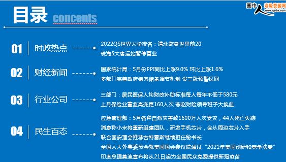 每日新闻速递 2021年6月10日 星期四 目录 时政热点 财经新闻 行业公司 民生百态 2022QS世界大学排名:清北跻身世界前20 珠海5大客运站暂停营业 国家统计局:5月份PPI同比上涨9.0% 环比上涨1.6% 多部门完善政府猪肉储备调节机制 设三级预警区间 三部门:居民医保人均财政补助标准每人每年不低于580元 上月保险业董监高变更160人次 燕赵财险领导班子大换血 应急管理部:5月各种自然灾害致1600万人次受灾,44人死亡失踪 消息称小米将重新组建团队,研发手机芯片,会从周边芯片入手 联合国安理会推荐古特雷斯继续担任秘书长 全国人大外事委员会就美国国会参议院通过“2021年美国创新和竞争法案”发表声明 印度总理莫迪宣布将从21日起为全国民众免费提供新冠疫苗 时政热点 2022QS世界大学排名:清北跻身世界前20 2021-06-09 10:46:30 来源:中国教育在线 世界高等教育研究机构QS Quacquarelli Symonds于今天发布了最新2022QS世界大学排名。今年的排名共有1300所院校上榜,是QS有史以来规模最大的一次世界大学排名。 其中,中国共有92所高校上榜,包括内地高校58所,香港高校7所,澳门高校2所,台湾高校25所。 此次排名中,首次有两所中国大陆大学跻身世界前20,即清华大学(世界第 17 名,亚洲第 3 名)和北京大学(世界第 18 名,亚洲第 4 名,上升了 5 位)。这是在十年的持续进步之后,中国高校所取得的最新的里程碑。 珠海5大客运站暂停营业 2021-06-09 14:08:19 来源:每日经济新闻 6月9日,珠海发布微信公众号发布通知,自6月10日零时起,三灶汽车客运站、南水汽车客运站、平沙汽车客运站、西埔汽车客运站和唐家湾招呼站等五个站场临时停止营业。 据悉,临时停业是进一步配合做好疫情防控工作、有效加强相关交通运输站场出省人员管控的需要。恢复营业时间需视防控情况另行确定。目前香洲长途汽车客运站、拱北通大汽车客运站、斗门汽车客运站等大型站场仍正常提供客运服务。