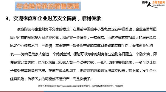 年金险销售逻辑财富传承篇 我国家族企业的 平均寿命只有24年 在中国,基业不常青已成常态 在2014年7月8日举办的“家族企业财富保全与传承论坛”上中国中小企业协会常务副会长张竞强公布的一组数据显示: 提升财富质量的有效途径---改善资产结构 “高净值人群的财富保障与传承的需求日益增加,财富管理需求呈现出综合化的趋势。这给高端财富管理机构带来新的挑战与机遇,除了传统的金融资产配置服务,也要为高净值人群提供家族财富管理、保险、慈善、信托等更加综合化的财富管理服务。” 年金险产品逐渐成为资产传承的工具 我们需要的高净值客户——客户画像 资产量:参考国际通行标准,《福布斯》中文版所定义的大众富裕阶层是指,个人可投资资产在约10万至100万美 元的中国中高产阶层群体。 基本情况:30岁-60岁,已婚,大专以上学历;收入稳定。投资情况:中低风险偏好;资金主要来源于工资和企业收入。 寿险需求递增 资产配置 资产传承 保障缺口 财富增值 生活保障 高净值人群的财富传承: 在中国,财富往往以家庭为单位存 续,“富不过三代“像一句魔咒让一些 人耿耿于怀。因此,家庭理财的特殊性 也为财富管理机构所重视,进而演化出 更具针对性的财富管理策略,买保险、 等一般操作,更具丰富性和专业性的家 族财富传承方案逐渐被人们接受。 4个调整:投保人可调整,受益人可调整,受益比例可调整,资金量可调整。 保单财富传承的优势1234 1个意愿:完成投保人生前意愿(想传谁就传谁,想传多少传多少) 2个确保:确保保值,确保增值(身故金确保保值,生存金确保增值) 3个统一:所有权,控制权,受益权(没有争议的三权统一)