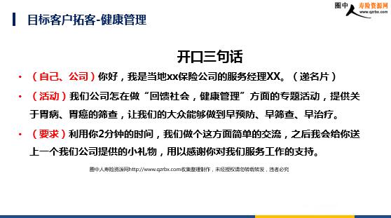 目标客户拓客-健康管理 思考 目标客户拓客-健康管理 如何用健康检测切入客户 目标客户拓客-健康管理活动目的 以回馈客户,收集名单,保证产说会持续经营为目的,在摆点过程中邀约准客户参加“健康管理”服务,邀约理由为:儿童癌症筛查。目标客户拓客-健康管理整体流程 搭建工作台 递送邀请函 目标客户拓客-健康管理 (自己、公司)你好,我是当地xx保险公司的服务经理XX。(递名片)(活动)我们公司怎在做“回馈社会,健康管理”方面的专题活动,提供关于胃病、胃癌的筛查,让我们的大众能够做到早预防、早筛查、早治疗。(要求)利用你2分钟的时间,我们做个这方面简单的交流,之后我会给你送上一个我们公司提供的小礼物,用以感谢你对我们服务工作的支持。开口三句话 是的,我是专门做保险服务的,可以为大家提供保险产品,这次活动我们将提供健康管理的服务,如果你有需要我很乐于为你提供专业的建议。这样吧,先坐下来我详细给你介绍一下!你们是卖保险吗? 我了解你的担心,你也知道买保险都是自愿的,又不是强买强卖。就算买了,合同拿到觉得不满意还可以全额退款又没有什么损失,对吧?活动的现场肯定会有产品的介绍(这次有一款员工福利专享的产品,抢到就是赚到),这个还是看你自愿呀。当然,本次活动就是以回馈为主,回馈是核心。对你来讲是有益无害呀,各种利益派送及会员专享,来宾礼品等,一定让你满载而归!这样吧,先坐下来我详细给你介绍一下! 目标客户拓客-健康管理 那太好了!说明你真的很有风险意识!不过说句实话,我们谁也不想去那这份报销单不是吗?这个活动是帮助我们早检测、早预防、早治疗,把风险降到最低,你是有风险意识的人,所以相信你最能明白其中的道理!这样吧,先坐下来我详细给你介绍一下!