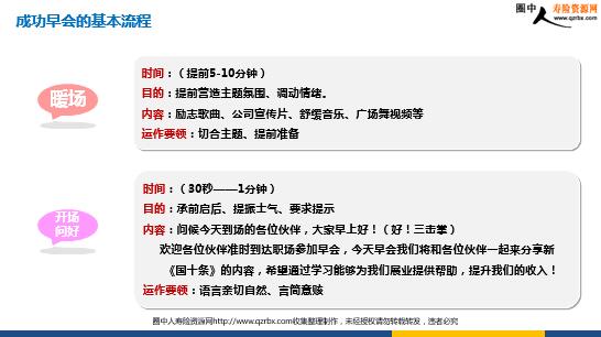 早会操作流程解析及成功七要素 据Limra统计: 差的职场氛围只能完成业绩的70% 好的职场氛围增加业绩从70%--130% 职场氛围的塑造从早会经营开始 早会经营的重要性 对参会人员进行必要的知识传承和有效的技能示范和训练,实现组织发展壮大; 调整参会人员的心态、提升团队的活动量和业绩; 寿险的经营是早会的经营,只有早会经营成功的营业部、营业室,其业绩才会保持均衡发展,而其经营发展也会在一个良性的轨道上运行。 早会经营的重要性 组训:组织高质量的早会 一日之计在于晨! 现在的早会存在哪些问题 早会经营常见的问题 【欠计划性】随意性强,缺乏追踪管理和连贯性,想哪说哪,指哪打哪 【欠变化性】形式单一,方法单调,思想单纯 【欠针对性】准备仓促,无阶段重点,不能与部门现有问题和公司阶段重点相协调 【欠纪律性】缺乏制度管理,员工出勤率低,会场纪律松散,形如茶楼 【欠激励性】缺少职场和环境氛围的营造,主持人纯粹凭感觉进行早会运作 【欠互动性】有时表现为讲师或主讲人的“独角戏”,有时又成为部经理的“训导会” 【欠趣味性】内容空洞枯燥,话题古老陈旧;讲师照本宣科,员工呆若木鸡 成功早会的基本流程 暖场 时间:(提前5-10分钟) 目的:提前营造主题氛围、调动情绪。 内容:励志歌曲、公司宣传片、舒缓音乐、广场舞视频等 运作要领:切合主题、提前准备 开场 问好 时间:(30秒——1分钟) 目的:承前启后、提振士气、要求提示 内容:问候今天到场的各位伙伴,大家早上好!(好!三击掌) 欢迎各位伙伴准时到达职场参加早会,今天早会我们将和各位伙伴一起来分享新《国十条》的内容,希望通过学习能够为我们展业提供帮助,提升我们的收入!