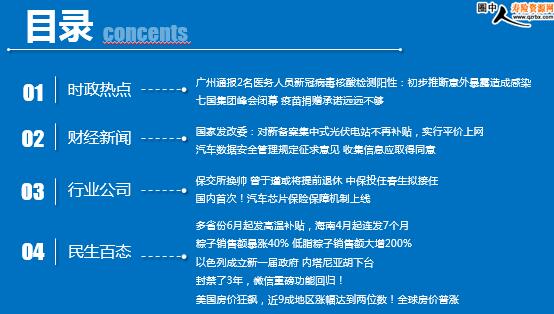 每日新闻速递 2021年6月15日 星期二 目录 时政热点 财经新闻 行业公司 民生百态 广州通报2名医务人员新冠病毒核酸检测阳性:初步推断意外暴露造成感染的可能性较大 七国集团峰会闭幕 疫苗捐赠承诺远远不够 国家发改委:对新备案集中式光伏电站不再补贴,实行平价上网 汽车数据安全管理规定征求意见 收集信息应取得同意 保交所换帅 曾于瑾或将提前退休 中保投任春生拟接任 国内首次!汽车芯片保险保障机制上线 多省份6月起发高温补贴,海南4月起连发7个月 粽子销售额暴涨40% 低脂粽子销售额大增200% 以色列成立新一届政府 内塔尼亚胡下台 封禁了3年,微信重磅功能回归! 美国房价狂飙,近9成地区涨幅达到两位数!全球房价普涨 时政热点 广州通报2名医务人员新冠病毒核酸检测阳性:初步推断意外暴露造成感染的可能性较大 2021-06-14 15:39:10 来源:界面新闻 6月14日,@健康广州 发布关于广州医科大学附属市八医院两名医务人员新冠病毒核酸检测阳性的通报。6月11日晚,广州医科大学附属市八医院在对医务人员进行的例行新冠病毒核酸检测中,发现两名阳性感染者。 七国集团峰会闭幕 疫苗捐赠承诺远远不够 2021-06-14 14:08:19 来源:新华网 为期三天的七国集团峰会13日在英国西南部康沃尔郡闭幕。尽管七国集团会后在新冠疫苗捐赠、经济复苏等领域做出承诺,但一些国际政要和机构指出,七国集团的承诺姗姗来迟,且远远不够。 七国集团在会后发表的联合公报中说,将在明年年底前为全球提供10亿剂新冠疫苗,以推动尽快结束新冠疫情大流行;将合作加强全球卫生应急体系,致力于把科学研发新疫苗的周期缩短至100天。