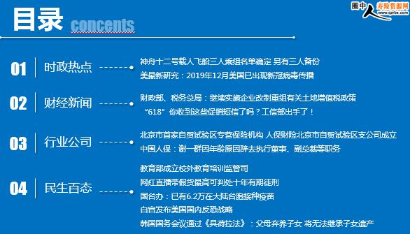 每日新闻速递 2021年6月17日 星期四 目录 时政热点 财经新闻 行业公司 民生百态 神舟十二号载人飞船三人乘组名单确定 另有三人备份 美最新研究:2019年12月美国已出现新冠病毒传播 财政部、税务总局:继续实施企业改制重组有关土地增值税政策 “618”你收到这些促销短信了吗?工信部出手了! 北京市首家自贸试验区专营保险机构 人保财险北京市自贸试验区支公司成立 中国人保:谢一群因年龄原因辞去执行董事、副总裁等职务 教育部成立校外教育培训监管司 网红直播带假货最高可判处十年有期徒刑 国台办:已有6.2万在大陆台胞接种疫苗 白宫发布美国国内反恐战略 韩国国务会议通过《具荷拉法》:父母弃养子女 将无法继承子女遗产 时政热点 神舟十二号载人飞船三人乘组名单确定 另有三人备份 2021-06-16 15:39:10 来源:新华网 中国载人航天工程办公室主任助理季启明在新闻发布会上介绍说,神舟十二号载人飞船飞行乘组由航天员聂海胜、刘伯明和汤洪波三人组成,聂海胜担任指令长,备份航天员为翟志刚、王亚平、叶光富。 三名航天员中,特级航天员聂海胜参加过神舟六号、神舟十号载人飞行任务,特级航天员刘伯明参加过神舟七号载人飞行任务,二级航天员汤洪波是首次飞行。 美最新研究:2019年12月美国已出现新冠病毒传播 2021年06月16日 22:31:00 来源:中国新闻网 据美国中文网报道,美国研究人员发现更多证据,说明新冠病毒早在2019年12月就在美国低水平传播,时间比正式报告确诊病例要早数个星期。最新发表在美国感染疾病学会《临床感染疾病杂志》上的报告称,研究人员对2020年前三个月采集的24000多个血样进行了分析,至少有9人的血液中含有新冠病毒抗体。 这些冷冻血液样本表明,在伊利诺伊州、威斯康星州、宾夕法尼亚州、密西西比州和马萨诸塞州正式报告新冠病毒病例前的几天或几周前,就有人感染了新冠病毒。
