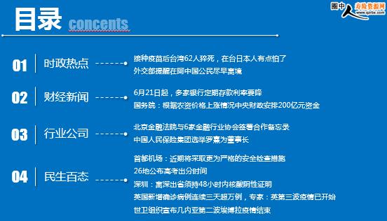 每日新闻速递 2021年6月21日 星期一 目录 时政热点 财经新闻 行业公司 民生百态 接种疫苗后台湾62人猝死,在台日本人有点怕了 外交部提醒在阿中国公民尽早离境 6月21日起,多家银行定期存款利率要降 国务院:根据农资价格上涨情况中央财政安排200亿元资金,对实际种粮农民一次性发放补贴 北京金融法院与6家金融行业协会签署合作备忘录 中国人民保险集团选举罗熹为董事长 首都机场:近期将采取更为严格的安全检查措施 26地公布高考出分时间 深圳:离深出省须持48小时内核酸阴性证明 英国新增确诊病例连续三天超万例,专家:英第三波疫情已开始 世卫组织宣布几内亚第二波埃博拉疫情结束 时政热点 接种疫苗后台湾62人猝死,在台日本人有点怕了 2021-06-19 15:39:10 来源:上海观察者 据台湾“东森新闻云”6月19日晚间消息,在日本赠送台湾124万剂阿斯利康疫苗后,岛内各地于6月15日开始扩大接种范围,岛内各地随即传出接种疫苗后的零星猝死案例。截至目前,岛内接种疫苗后猝死者飙至62人,最年轻者仅42岁。 6月19日,日本媒体《日刊现代》发表文章称,伴随着猝死案例的集中涌现,台湾岛内的日本人开始担心台湾地区对日本的“感情”恶化。一名岛内日本人对其表示,“台湾地区的变化,比日本人想象得快得多,我甚至感到了愤怒的迹象。” 外交部提醒在阿中国公民尽早离境 2021年06月20日 12:31:00 来源:新华网 据外交部“领事直通车”微信公众号消息,今年以来,阿富汗国内冲突不断,恐袭频仍,安全形势更趋严峻复杂。外交部和中国驻阿富汗大使馆提醒在阿中国公民和机构进一步加强防范和应急准备,并利用国际商业航班等尽早离境。如遇紧急情况,请及时报警并与中国驻阿富汗大使馆联系。