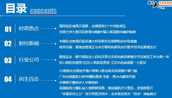 每日新闻速递 2021年6月25日 星期五 目录 时政热点 财经新闻 行业公司 民生百态 高风险区域再次清零,全国现有9个中风险地区 甘肃兰州七里河区新增1例境外输入新冠肺炎确诊病例 中国在世贸组织起诉澳大利亚相关反倾销和反补贴措施 林郑月娥:香港金管局正与央行等机构研究央行数字货币在跨境支付中的应用 银保监会:银行保险法人机构及其分支机构换发新版许可证换发工作为期一年 安心财险拟增资7亿引入两家投资者 江苏华远或成第一大股东 15省提出全面放开落户限制 6省会率先实现落户零门槛 广州出现最短14秒传播的案例 专家:两米内都有可能 中国普天整体并入中国电科 英国航母分舰队闯入俄罗斯领海,俄军舰机开火警告,发现即毁灭 “杀毒软件之父”死于西班牙狱中,去年曾发有关“自杀”神秘推文 时政热点 高风险区域再次清零,全国现有9个中风险地区 2021-06-24 15:39:10 来源:北京日报 刚刚,全国个别区域疫情风险等级又有调整: 经广州市新冠肺炎防控指挥部同意,自2021年6月24日起,广州市荔湾区白鹤洞街由高风险地区调整为中风险地区。其他地区风险等级不变。至此,全国疫情高风险地区再次清零。 甘肃兰州七里河区新增1例境外输入新冠肺炎确诊病例 2021年06月24日 12:31:00 来源:21世纪经济报道 甘肃省兰州市七里河区新冠肺炎疫情联防联控工作领导小组办公室今天(24日)发布通报表示,2021年6月24日,甘肃省新型冠状病毒肺炎疫情联防联控工作领导小组办公室确认,七里河区新增1例新冠肺炎确诊病例。目前该病例已转运至兰州市肺科医院进一步诊治,其家人和2名出租车司机已送往集中隔离点进行隔离医学观察。