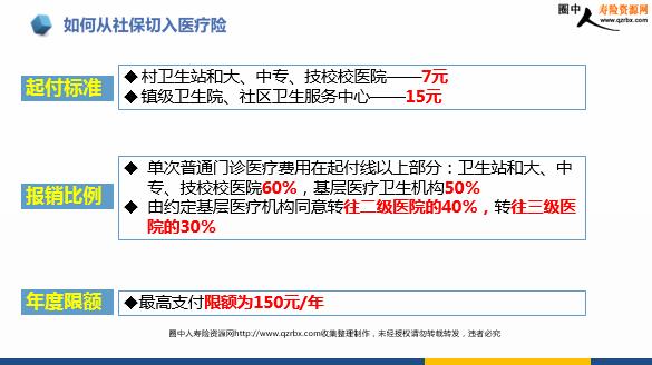 如何从社保切入医疗险 一、社保概念 社会保险是国家通过立法,由劳动者、劳动单位、国家三方共同筹集资金,在劳动者在年老、疾病、工伤、生育、失业、死亡等遇到风险时,给予最基本的物质帮助,以保障其基本生活的一种制度。 如何从社保切入医疗险 基本医疗保险是为补偿劳动者因疾病风险造成的经济损失而建立的一项社会保险制度。通过用人单位和个人缴费,建立医疗保险基金,参保人员患病就诊发生医疗费用后,由医疗保险经办机构给予一定的经济补偿,以避免或减轻劳动者因患病、治疗等所带来的经济风险。 社保之医疗保险 如何从社保切入医疗险 城镇居民基本医疗保险 农村合作医疗保险 城镇职工基本医疗保险 并轨统称城乡居民基本医疗保险 医保 如何从社保切入医疗险 1、连续足额缴纳基本医疗保险费的,次月享受; 2、中断后再次参保的,补足中断期间所欠基本医疗保险费,在连续足额缴纳基本医疗保险费满六个月后,方可重新享受医保待遇。 领取条件(享受条件) 城镇职工 城乡居民 1、参保或续保时间为每年9月1日至11月30日,从次年1月1日起享受年度城乡居民医保待遇。未在规定时间内办理参保或续保手续的,只能于下一年度办理。 2、出生三个月内参保缴费的新生儿享受城乡居民医保待遇时限为从出生起至当年度12月31日止;出生三个月后参保缴费的,从缴费次月起至当年度12月31日止。 如何从社保切入医疗险 城镇职工享有住院补充医疗待遇 异同点 普通门诊待遇门诊特殊病种住院医疗大额医疗 . 相通点 城镇职工与城乡居民的领取待遇 如何从社保切入医疗险 城镇职工普通门诊统筹金在职人员每人每年550元,退休人员每人每年700元,不设置每天的最高支付限额,具体的待遇标准详见下表: 参保人员个人账户划入普通门诊统筹金中的金额在扣除由普通门诊统筹金支付的金额后,余额部分按在职人员按60%、退休人员按70%返还个人账户。办理了长期异地居住的参保人员也按以上规定执行。以灵活就业人员为身份参保的除外。