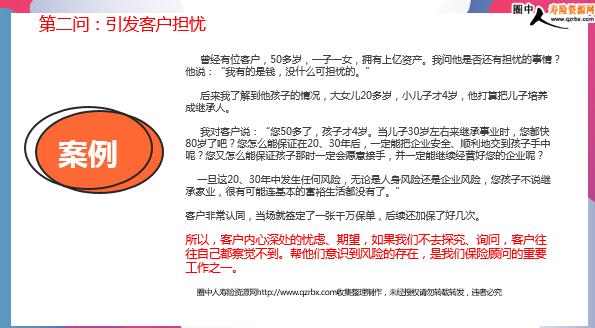 高额保单成交技巧五问宝典 前言 随着服务的高端客户日益增多,越来越觉得高端客户都有一个共性: 时间对于他们来说特别宝贵,他们喜欢高效、简洁的沟通。 因为高端客户办起事来非常重效率,经过多年摸索,总结了一个将需求面谈与成交面谈相结合的销售流程,这种方式能最大程度地节省客户时间,简单高效地为其提供高品质的专业服务。 当然,这套销售流程的前提是准备充分。 因为高端客户只会给我们一次展现专业的机会,所以面谈前的充分准备至关重要,这会直接决定最终效果。 五问宝典 第一问:切入保障需求 “为了更好地为您的家庭量身定做保障计划,请您配合如实地介绍一下您的家庭情况,好吗?” 很多人担心客户不太愿意如实告知家庭情况,其实越高端的客户越尊重专业、认同专业,他们认为专业的事情应该交给专业人士去打理。 第一问:切入保障需求 面对能为其提供风险保障的专业人士,他是会如实告知其家庭与企业情况的。 当然,作为一名专业的保险顾问,在我们与高端客户会面前,应该对其大致情况已有了解并设计好了匹配的方案。 但无论我们对他的状况了解得有多清楚,都应该请客户自己来介绍,这样有利于营造轻松的谈话氛围,了解客户的真实需求。 第二问:引发客户担忧您这样的家庭,最担心的是什么?” 客户的担忧就是他们的需求。作为专业的保险顾问,我们就是来帮客户解决担忧、完成心愿的。一般说来,高端客户的担忧有以下两个: 第二问:引发客户担忧 1人身保障 他们担心在遭遇疾病、意外导致的人身风险时,一方面会对家庭造成巨大的经济影响,让所爱的人无法再享受优渥生活;另一方面,会让辛苦打拼来的财富不能按自己的意愿进行传承。 针对高端客户对自身人身保障的需求,我们一般可以匹配以下几个险种: 第二问:引发客户担忧 高额的终身寿险 高额的终身寿不仅可以提供充足的人身保障,以确保任何情况下都能维持家庭基本生活品质,也能有效实现将财富以安全的方式按意愿进行传承。 高额的意外险 高端客户需要经常外出,遭遇意外的风险概率较普通人高。而且拥有巨额财富的他们,一旦遭遇意外风险,损失巨大。高额的意外保障可以转嫁这些风险 高端医疗险 高端客户不幸罹患疾病,需要的不仅仅是顶尖的医疗资源,还要有顶级的医疗服务体验。只有高端医疗可以满足高端客户个性化、高水平的医疗需求。 第二问:引发客户担忧 2资产保全 在这个充满不确定性的世界里,企业家担心会遭遇经营风险、政策风险、法律风险、婚姻风险,他们期望能规划税收、保全财产,并安全传承给下一代,打破“富不过三代”的魔咒,让世世代代都富有。