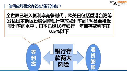 如何应对喜欢存钱在银行的客户 中国人为什么那么热爱储蓄? 如何应对喜欢存钱在银行的客户 教育问题 养老问题 资金应急 房屋还贷 医疗问题 未来忧虑 理财专家指出 一个家庭,最理想的储蓄是半年到一年的生活费用。多余的钱应该做更合理的规划与配置。因为钱存在银行短期看起来很安全,长期却是最危险的方式。 银行存款两大风险 零利率 通货膨胀 全世界已进入低利率竞争时代,欧美日包括香港台湾等发达国家地区纷纷调降银行存放款利率到1%甚至接近零利率的水平,日本已经18年银行一年期存款利率在0.5%以下 钱到底放在哪里才能安全、稳健,还能保值、增值、应急? 案例分析 姓名:王先生年龄:30岁职业:外资高管年收入:30万家庭幸福美满!!!!档案 王先生在一次出差途中,遭遇了重大交通事故。万幸的是,经过及时抢救保住了生命,却落得全残。 王先生曾给自己购买了一份年交保费3万元、交费年限为30年、保险责任范围涵盖:人身意外保险金额180万元,重大疾病保险金额80万元,住院医疗限额10万元、住院医疗限额10万元,意外医疗限额5万元的保险。事故发生后,王先生除了获得国家与用人单位相关的赔偿外,还获得了保险公司高达180万元的全残保障金。同时,王先生还获得除去社保报销之外,15万元医疗费用的报销! 高额的全残保险金雪中送炭解决了王先生家庭的燃眉之急,昔日的生活品质并未因王先生全残导致下降,因为保险公司替王先生扛起了一面“家庭责任”的大旗。 假设,王先生当初采取以银行存款的方式来应对风险,那结果会如何呢??? 存银行 王先生每年存款3万元,第三年总共存款9万元。若按5%的利率来计算,那么3年后王先生的银行存款约为10万元。面对这突如其来的风险,银行存款10万元难以支付高额的医疗费用。不仅如此,王先生也会因全残导致失去收入来源,其家庭将面临更大的困境。 以预定利率锁住长期的投资回报率。
