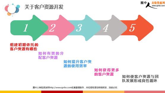 客户资源的利用与再开发 前言/PREFACE xx业务经营的关键在网点经营。网点经营的关 键在客户经理能够自主经营。 客户经理自主经营的技能始于培训,精于实践, 举一反三,总结提升。 教会理财经理有效利用资源 年龄方面:◆第一阶段:单身期间(18-25岁)以强制储蓄,自身保障为主◆第二阶段:成家立业期(25-45岁)子女的教育基金、大病、购房购车的储备金◆第三阶段:退休规划期(45-60岁)退休后的生活保障、大病保障 教会理财经理有效利用资源 ◆家庭住址:对城市生活环境进行划分,根据居住区域不同来初步判断客户的家庭经济水平◆已缴保费:客户存入我们公司只是一部分钱,存多少并不代表就只有多少;可以根据保费额度预估客户的经济水平◆缴费方式:趸交或者是期交(xx)◆职业类别:预估客户的月收入、年收入水平分析客户需求,根据基本情况,初步判断客户需求的险种类别 及时对客户资料进行补充 教会理财经理有效利用资源 为什么要对客户资料进行有效的管理综合理财成功的基石理财经理赖以生存的基础管理者管控团队的有利抓手 组建初期依托的客户资源有哪些 如何有效的分配客户资源 如何提升客户资源的使用效率 如何获得更多的客户资源 如何使客户资源与团队发展形成良性循环 关于客户资源开发 一、组建初期依托的客户资源 银保渠道资源 引进团队原有客户 缘故市场客户 银行人员转介绍 社区及摆台吸引 二、如何有效的分配客户资源 1、功能组精细化资源分类2、活动及主题策划得当3、加大活动量、服务频率4、组合销售、优势互补5、流程标准化、统一化6、监控效率、制度为先