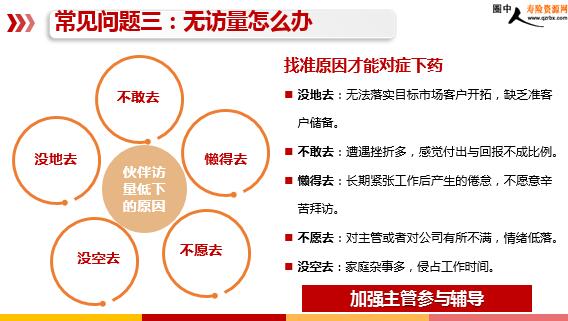 小早管常见问题异议处理 讨论 一、你所在的单位启航班活动量管理中常见的问题有哪些? 启航营小早管遇到的常见问题 小组长不会召开小早;小早管环节小组成员不汇报或敷衍了事;小早管环节小组成员汇报活动量多但业绩少;组员没有访量怎么办;电话邀约如何保证质量; …… 常见问题一:小组长不会召开小早 做好营前准备:营内迎新会选举组长后,第一天结课后由营长对组长进行每日早会活动量检查、统计和播报训练。活动量播报训练步骤:检查数据:组长检查每个组员xx业绩、xx业绩汇总登记:组长使用工具《活动量汇总登记》进行相关活动量数据登记。分组汇报:X组应到X人,实到X人,XX缺勤情况,XX的活动量是周经营分数--拜访数量--平台参与数量--短险数量--长险数量--增员数量。 常见问题二:成果分享环节无亮点 先挖掘优点再提出改善点现场纠偏 常见问题三:无访量怎么办 当小早管问及活动量拜访情况时, X伙伴表示没有拜访,你该怎么办? 常见问题三:无访量怎么办 找准原因才能对症下药没地去:无法落实目标市场客户开拓,缺乏准客户储备。不敢去:遭遇挫折多,感觉付出与回报不成比例。懒得去:长期紧张工作后产生的倦怠,不愿意辛苦拜访。不愿去:对主管或者对公司有所不满,情绪低落。没空去:家庭杂事多,侵占工作时间。 加强主管参与辅导 常见问题三:无访量怎么办 (1)为何不拜访客户情景一:心态不好,不想见客户。辅导员/主管:是不是家里有事?还是在昨天拜访种遇到什么困难?伙伴:打了10个电话,都没有约访成功。辅导员/主管:你是怎么说的,客户是怎么回答的?伙伴:具体描述,主管认真聆听。辅导员/主管:好的,知道了,这样,课程结束后你留下我们单独再沟通下…… 常见问题三:无访量怎么办 (1)为何不拜访客户情景一:心态不好,不想见客户。辅导员/主管:刚才在活动量汇报环节你也把基本情况说了,这样,为了了解具体情况,你现在就从客户P100表中找2个客户,现场打电话约访我看看。伙伴:好的(根据伙伴的实际情况给与技能辅导)辅导员/主管:今天的辅导就到这里,你清楚了吗?是否有收获呢?…但还有些观念想和你沟通下:其实退却是容易的,但是一旦养成了习惯,命运就将定格。做销售使我学到了一个原则:失败充其量只是没得到想要的,我们其实是一无所失的。明白了这个道理,我时常提醒自己:如果一件事儿做成了,收益很大;失败了,没什么损失的话,就立即去做,并应坚持到底。我们最大的障碍是怯于拜访,当我们知道自己一无所失,反可以收获经验教训的时候,就能够勇气倍增,行动力加强了而去做,就是做的最大收获。该做的事情一定要立即去做,逃避不可能让我们完成它。拜访客户不是得到就是学到,观念影响行动,希望接下来能看到更棒的你哦!