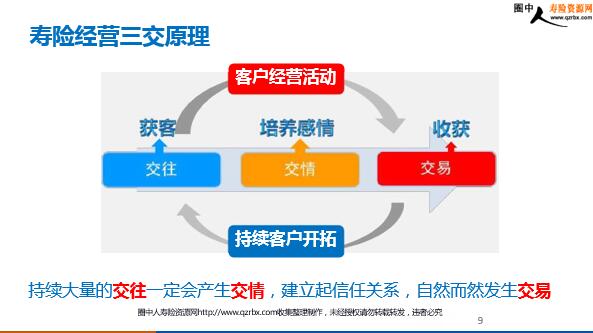 持续获客的重要性路径和方法 课程目标: 明确持续获客的重要性,认知寿险经营的根本还是客户,了解持续获客的路径和方法。 目录 CONTENTS 持续获客的重要性 持续获客的路径和方法 3 持续获客的重要性 你最羡慕这些顶尖高手的哪个方面? 万众瞩目的荣誉? ü百万千万的收入? ü高效成交的专业? ü…… 高绩优的底气来自源源不断的准客户! 大咖高手这样看待客户开拓和经营: 持续获客的重要性 积累大量的准客 户是保险事业持 续发展的保证 建立多个人脉圈,通 过裂变就能获得源源 不断的客户源 客户数量是保险事业 成功的基础 8 客户经营活动 持续客户开拓 寿险经营三交原理 持续大量的交往一定会产生交情,建立起信任关系,自然而然发生交易 寿险营销本质:以人为本,关系营销 持续获客的路径和方法 11 研讨发表: 1、您常用的获客路径和方法有哪些? 2、您认为获客的路径和方法还有哪些? 活动 平 资源类 渠道资源 打造影响力中心 随机拜访 新人推介会晋升见证会五同会 社交软件类生活服务类搜客类公司软件类其它应用类 公益活动慈善类环保类健康类 公司活动亲子教育休闲娱乐文化艺术 团队个人活动美食玩乐素养 存量保险客户服务类客户资源 民间协会群亲子群兴趣爱好群 银行、证券等金融机构美容、健身等生活会所直销、网销、微商等房产中介、电信黄页等中介渠道其它机构 总结一下:获客路径 自媒体——打造你的个人IP 借自媒体平台找到客户,分类建微信群,持续经营人脉