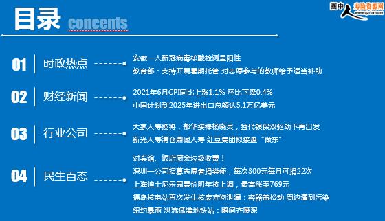 每日新闻速递 2021年7月10日 星期六 目录 时政热点 财经新闻 行业公司 民生百态 安徽一人新冠病毒核酸检测呈阳性 教育部:支持开展暑期托管 对志愿参与的教师给予适当补助 2021年6月CPI同比上涨1.1% 环比下降0.4% 中国计划到2025年进出口总额达5.1万亿美元 大家人寿换将,郁华接棒杨晓灵,独代银保双驱动下再出发 新光人寿清仓鼎诚人寿 红豆集团拟接盘“做东” 对宾馆、饭店厨余垃圾收费! 深圳一公司招募志愿者捐粪便,每次300元每月可捐22次 上海迪士尼乐园票价明年将上调,最高涨至769元 福岛核电站再次发生核废弃物泄漏:容器盖松动 周边遭到污染 纽约暴雨 洪流猛灌地铁站:瞬间齐腰深 时政热点 安徽一人新冠病毒核酸检测呈阳性 2021-07-09 09:09 来源:新京报 据人民网安徽官微消息,有1例新冠病毒核酸检测阳性人员王某某(萧县人),现正在萧县隔离点进行集中医学观察。 昨晚(7月8日),定远县新冠疫情防控应急指挥部办公室发布紧急通告:2021年7月8日20时41分,定远县疫情防控应急指挥部办公室接滁州市疫情防控应急指挥部通知:有1例新冠病毒核酸检测阳性人员王某某(萧县人),曾于7月7日17时19分从杭州东乘坐高铁G7610次列车至徐州东站下车,该班次列车于当日20时24分-20时42分在定远高铁站停留。 教育部:支持开展暑期托管 对志愿参与的教师给予适当补助 2021-07-09 09:42 来源:环球网 日前教育部印发了《关于支持探索开展暑期托管服务的通知》引导支持有条件的地方积极探索开展暑期托管服务工作。 《通知》提出,地方教育部门要从本地实际出发,鼓励有条件的学校积极承担学生暑期托管服务工作。地方教育部门和学校要积极引导和鼓励教师志愿参与学生暑期托管服务,不得强制对志愿参与的教师应给予适当补助。要统筹合理安排教师志愿参与托管服务的时间,保障教师权益,既要保障教师暑假必要的休息时间,也要给教师参与暑期教研、培训留出时间。