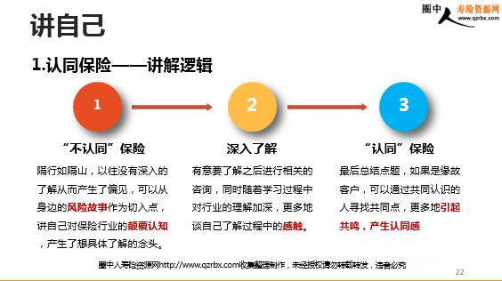 三讲助我轻松面谈 初为保险销售员,大家是否有些困惑: 不敢见客户不知道如何开口说保险 …… 曾经有无遇过口若悬河、滔滔不绝的保险销售员?什么感受? 保险销售不在于你会不会说、说多说少,而在于你说得对、说得恰当,所以形成自己的销售逻辑非常重要。 三讲的重要意义 某营销员甲和杨先生是同学,多次谈过保险,但杨先生一直没有购买。某天,甲找到杨先生,对他说:“今天是公司考核最后一天,如果这个月我还没开单就会被开除了。老同学帮帮忙,买份保险吧。”碍于情面,杨先生勉强买了一份保险,年交保费3000元。 案例介绍 一个月后,另一保险公司的营销员乙通过朋友介绍拜访了杨先生。乙跟杨先生谈了自己大学毕业后为什么选择寿险营销工作,以及为什么选择现在的公司。杨先生被乙的专业和理想所打动,对保险和他所在的公司有了新的认识。一周后,杨先生给全家购买了健康保险,年交保费10万元。 同一个客户面对不同的营销员做出的购买决定相差几十倍甚至上百倍! 准客户购买的心理疑虑 ——讲保险 ——讲公司 ——讲自己 我为什么要买保险?我为什么要在xx买保险?我为什么要在你这里买保险? 思考 如何解决 “三讲”就是—— 讲自己讲保险讲公司 “三讲”的作用—— 产生认同建立信任达成委托 重要提示—— 无论是缘故还是陌生客户无论他多么急于了解产品都必须先讲“三讲” 什么时候讲“三讲”? 寒暄赞美之后销售面谈之前 营造轻松的面谈氛围,顺利导入“三讲” 缘故客户如何切入讲“三讲”? 明确告诉对方自己做保险了 例:我换工作了,到xx人寿做保险了。(倾听缘故客户回答) 缘故客户的异议问题—— 婉转式拒绝 关怀式拒绝 无论缘故客户提出了什么异议,都要向“对保险多一些了解”的方向引导 认同:是啊,我以前也没想过会去做保险。反问:不过,保险也没什么不好啊,你说呢?引导:听你这么说,我感觉你对保险好像不是很了解嘛,你或许想知道我为什么选择做保险。