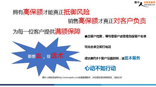 太保红本训练之满额销售 销售方式:满额销售 话术:您看,我刚刚给您规划的是目前最基础的家庭需求,现在好多客户购买的都是满额重疾险,您知道什么是满额吗?其实保险不是想买多少就能买多少,是有封顶限制的,我来给您讲讲什么是“满额”。目前疾病发生的时间、病种、花多少钱都不确定,所以才需要提前准备医疗金把缺口补齐,不管花多少钱看病咱都心疼,因为咱挣钱攒钱太不容易。比起庞大的医疗费,保费微不足道。您的年龄XX岁,最多只能保XX万,这是你的最高限额(如有想购买更高保额的客户,则需要体检)。 何为“满额” 销售方式:满额销售 话术:从今天的医疗费用来看,你最少还得补充XX万保额,才能够达到满额。买重疾保险就是为了解决将来医疗费的问题,如果保的5万10万解决不了问题等于没买,风险无情,想想保额不够有多可怕啊!现在的保险不是说你想买多少就能买多少,保险公司为了控制风险,是有保额限制的(以石家庄为例): 18岁--40岁最多只能保70万,41岁--45岁最多只能保55万,46岁—50岁最多只能保40万,51岁--55岁最多只能保20万。看您今年XX了,最多只能保XX万,想多保都不行。 促成“满额” 拥有高保额才能真正抵御风险 销售高保额才真正对客户负责 要想富,背话术 拿出客户档案,填写准客户或者准加保客户名单 写完名单立即打电话 成功邀约3个客户见面时间,送蓝本服务 心动不如行动 为每一位客户提供满额保障