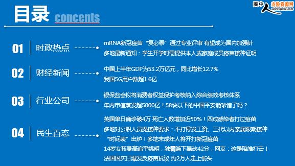 每日新闻速递 2021年7月16日 星期五 目录 时政热点 财经新闻 行业公司 民生百态 mRNA新冠疫苗“复必泰”通过专业评审 有望成为国内加强针 多地最新通知:学生开学时需提供本人或家庭成员疫苗接种证明 中国上半年GDP为53.2万亿元,同比增长12.7% 我国5G用户数超1.6亿 银保监会拟将消费者权益保护考核纳入综合绩效考核体系 年内市值蒸发超5000亿!58块以下的中国平安能珍惜了吗? 多地对公职人员提接种要求:不打停发工资、三代以内亲属限期接种 “时间表”出炉!多地未成年人将开打新冠疫苗 14岁女孩身高追平姚明,独霸篮下暴砍42分,网友:这是降维打击! 英国单日确诊破4万 死亡人数增加近50%!四成感染者打过疫苗 法国国庆日爆发反疫苗抗议 约2万人走上街头 法国疫情最新消息情况第四波疫情或“成为现实” 时政热点 mRNA新冠疫苗“复必泰”通过专业评审 有望成为国内加强针 2021-07-15 09:09 来源:同花顺财经 7月14日,复星医药在股东大会上回复投资人问询时表示,国家药监局对mRNA新冠疫苗“复必泰”的审定工作已经基本完成,专家评审已经通过了,目前正在加紧进行行政审批阶段。复星医药已与BioNTech提前启动生产准备工作,复必泰疫苗一旦获批,就能第一时间供应到国内;知情人士称,未来,复必泰在国内很可能会作为加强针使用,免费接种。 多地最新通知:学生开学时需提供本人或家庭成员疫苗接种证明 2021年07月14日 15:12:50 来源:人民日报 近日,陕西、四川、浙江、江西等下属的多个县市疫情防控指挥部办公室陆续发布“未接种新冠疫苗原则上不能进入重点公共场所”的通知,上述公共场所涵盖学校、医疗机构、火车站、商场超市、农贸市场、景区景点等。此外,健康时报记者注意到,还有部分地区在公告里提到,开学时学生需提供本人或家庭成员接种证明,家庭成员未接种新冠疫苗的,原则上暂缓入学。
