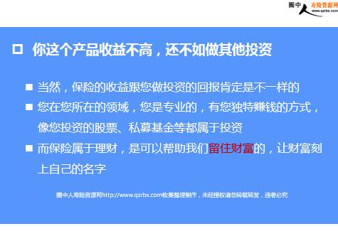 与私营企业主谈年金险 对照自己的企业主客户,意识到他们家企资产混淆;对税务规划和法律认知甚少,更需要年金险规避风险 TOP推荐课程--《企业家财富管理五大需求》 年金险是资产配置中必不可少的一部分,鸡蛋不能放在一个篮子里 年金险对企业主的价值1 金钱没有固定的主人,财富创造的过程就是财富流动的过程,未来不可预料,必须有一笔锁定的可控制的财富年金险对企业主的价值2 保单贷款功能,让死钱变活钱,可以提供安全稳定的现金流,解决燃眉之急年金险对企业主的价值3我的年金险面谈逻辑 讲自己建立信任讲保险功能切入年金险画资产配置图引导需求借助利率走势图促成保单 讲自己:突出我的专业,让客户放心我会一直干下去 已经服务八年:我是x年x月加盟xx人寿,至今已有8年时间,服务了近千名客户,也获得了国际IDA龙奖承诺:请您放心,我会在这个行业一直干下去年金险面谈逻辑 讲公司、讲自己建立信任讲保险功能切入年金险画资产配置图引导需求借助利率走势图促成保单 直接提问,切入保险您是否买过保险?买过什么保险?不管客户如何回答,我都会说保险分为两大类:保人和保钱 保险 简单介绍 大事、小事、无事 资产剥离、转移、传承 保人:就是保住赚钱的人 保钱:就是守住赚到的钱您看您的车每年会买车险,简而言之保人就是要保障人的身体或寿命,这就需要重大疾病险和医疗险来解决 金钱没有固定的主人,财富是不断流动的,您看您现在赚取的财富并不一定以后还是您的钱,保险就是让我们现在赚到的钱刻上自己的名字,可以保证财富永不流失。案例:国美电器黄光裕的妻子杜娟,就是利用大额年金险拯救了国美 年金险面谈逻辑 讲公司、讲自己建立信任讲保险功能切入年金险画资产配置图引导需求借助利率走势图促成保单 讲如何保钱,画资产配置图重点讲第四象限 40%的钱主要就是“保钱”,最重要的是要保证本金的安全,保证收益,保证持续的现金流,这一部分也就相当于金字塔最底层牢不可破、最坚固的部分 标准普尔象限图,是世界公认的,最具权威性的家庭资产配置准则