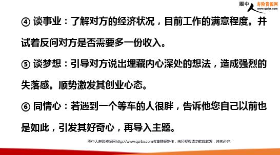 销售【陌拜】技巧 做销售,你熟悉的朋友是有限的,陌生的市场却是无限的,熟人的市场占30%,陌生的市场占70%,陌生市场才是你真正的生意场! 01为什么要开发陌生市场? 很多人,对于直销都有一种误解,认为直销主要是做熟人市场。其实不然:假设你的交际能力比较强,有100个朋友,他们每个人买你一款产品,你一下子可以卖100款。 一款产品可以吃3个月,那剩下的两个月你该怎么办?或者说他们打死也不接受你的推荐又该怎么办?所以,我们应该在熟人生意的基础上,将更多的时间转移到开发陌生市场。 02开发前的准备要点 ①要有好的仪表,得体的装束。 ②礼仪为重:点头、微笑、握手、问好。 ③积极、热情、正面、绅士风度。 ④语言清晰、充满真诚、准确简练。 ⑤产品知识、行业知识熟练充分准备。 03赢得陌生市场的策略 ①随机推荐将推荐融入生活中。产品、资料、名片随身携带。利用时机积极行动。 ②有目的的推荐了解地域、职业、性别、习惯。具备勇气与耐心面对拒绝。根据顾客的特性侧重介绍。 ③善于“造势” 制造悬念引起注意引起兴趣引起联想引起欲望引起决定引起行动 04占据主动优势 ①勇于开口争取心理准备充分。正确自我定位。学会看时机找好话题。循序渐进建立情意,不要过分热情急于求成。 ②广泛参加社会活动,扩大交际范围 善于与比自己强的人交往。不要过分自强、自大、不接纳人。适应对方的习惯使对方解除戒心。 ③善于观察亲和力好、号召力强的人。有爱心的人。怀才不遇的人。找机会的人。有钱没时间。经济富裕精神空虚。 05拜访陌生人的准备工作 ①保持微笑和良好的个人形象。 ②以交朋友的心态来结识对方,拉近双方的距离。 ③平常心,不带任何功利的想法,争取给对方好的第一印象。 ④敢于推荐自己,营造信任氛围,否则多说无益。 ⑤言之有理,言之有物,让对方感兴趣,愿意与你交谈。 ⑥寻求,发现,创造切入点。 06如何与陌生人切入话题 ①从健康话题入手,关注对方的健康状况。 ②谈论健康,养生的相关方法,导出正确的健康理念。 ③谈论药食同源的优势,有策略地导入劳模的产品。 ④谈事业:了解对方的经济状况,目前工作的满意程度。并试着反问对方是否需要多一份收入。 ⑤谈梦想:引导对方说出埋藏内心深处的想法,造成强烈的失落感。顺势激发其创业心态。 ⑥同情心:若遇到一个等车的人很胖,告诉他您自己以前也是如此,引发其好奇心,再导入主题。 ⑦因势导入:如果人询问你为何如此健康漂亮,告诉他,你目前正在使用劳模产品。