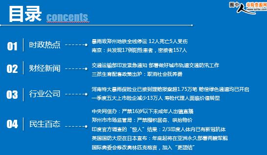 每日新闻速递 2021年7月22日 星期四 目录 时政热点 财经新闻 行业公司 民生百态 暴雨致郑州地铁全线停运 12人死亡5人受伤 南京:共发现17例阳性患者,密接者157人 交通运输部印发紧急通知 部署做好城市轨道交通防汛工作 三孩生育配套政策出炉:取消社会抚养费 河南特大暴雨保险业已接到理赔报案超1.75万笔 赔偿绿色通道均已开启 一季度五大上市险企减少13万人 寿险代理人面临价值转型 中央网信办:严禁16岁以下未成年人出镜直播 郑州市市场监管局:严禁囤积居奇、哄抬物价 印度官方调查的“惊人”结果:2/3印度人体内已有新冠抗体 英国国防大臣在日本宣布:年底起将在亚洲永久部署两艘军舰 国际奥委会修改奥林匹克格言,加入“更团结” 时政热点 暴雨致郑州地铁全线停运 12人死亡5人受伤 2021-07-21 07:30 来源:新京报 据@郑州发布官方微博 消息,自7月17日以来,郑州市连降罕见特大暴雨,造成郑州地铁发生积水等情况,郑州地铁启动紧急响应机制,全面疏散乘客。 此次强降雨造成郑州地铁5号线五龙口停车场及其周边区域发生严重积水现象,7月20日18时许,积水冲垮出入场线挡水墙进入正线区间,造成郑州地铁5号线列车在海滩寺街站和沙口路站隧道列车停运。18时10分,郑州地铁下达全线网停运指令,组织力量,疏散群众,共疏散群众500余人,其中12人经抢救无效死亡、5人受伤(均已送医)。 南京:共发现17例阳性患者,密接者157人 2021-07-21 07:30 来源:每日经济新闻 南京市20日通报,在禄口国际机场工作人员定期核酸检测样品中,已检测出阳性9份。今天13时,南京市举行新闻发布会,通报禄口国际机场新冠肺炎疫情防控最新情况。南京市政府副市长胡万进表示,经复合与专家组诊断,总共发现17例阳性患者目前9人为确诊病例,其中4个为轻型,5个普通型,5人为无症状感染者,还有3例核酸检测阳性还待进一步的诊断。截至7月21日5时,已经排查出阳性检测人员的密切接触者157人,密接的密接56人,其他的人员还在进一步的排查过程中。