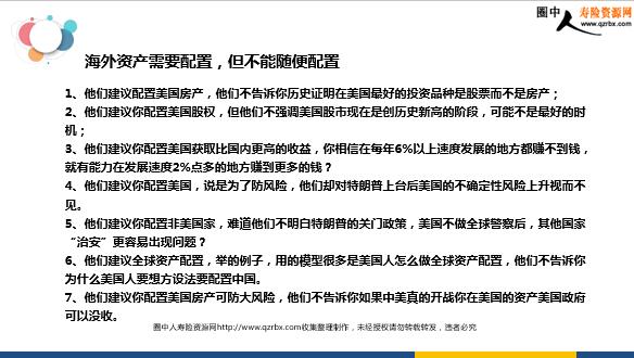 未配置保险的理财人士观念转化策略 前言/PREFACE xx业务经营的关键在网点经营。网点经营的关 键在客户经理能够自主经营。 客户经理自主经营的技能始于培训,精于实践, 举一反三,总结提升。 客户说我要转移到海外客户说我要买香港保单 配置海外资产的客户 金融账户涉税信息自动交换标准"(CRS) CRS的实施,在一定程度上意味着中国开启了“全球征税”模式,不少高净值人士的海外资产即将“裸奔”。 受美国政府《海外账户税收合规法案》(FATCA)的启发,2014年7月经济合作与发展组织(OECD)和G20组织发布了《金融账户涉税信息自动交换标准》和多边管辖权协议(MCAA),旨在维护诚信的税收体制。这个系统也称为共同报告标准(CRS)。 对于高净值客户而言,其在海外的资产将不再隐蔽,并且极有可能被各国的税务机关进行信息交换。 规定各签约协议国的金融机构,包括银行、保险公司、证券公司、基金公司等需要向中国税务总局自动提交(即无须知会及得到客户同意的情况下)中国公民及税务居民身份的一切资产、投资资料。 凡持中国公民身份及怀疑是中国税务居民身份的,最早追溯至2014年9年以后中国公民或怀疑税务居民,都定义为须向中国税务总局自动申请的人群。 国家税务总局10月14日发布,就《非居民金融账户涉税信息尽职调查管理办法》(以下简称《管理办法》),向社会公开征求意见,意见截止到10月28日。备受瞩目的境外账户披露以及金融账户信息交换的具体办法浮出水面。 CRS的运行机制什么样? 首先由一国(地区)金融机构通过尽职调查程序识别另一国(地区)税收居民个人和企业在该机构开立的账户,按年向金融机构所在国(地区)主管部门报送上述账户的名称、纳税人识别号、地址、账号、余额、利息、股息以及出售金融资产的收入等信息,再由该国(地区)税务主管当局与账户持有人的居民国税务主管当局开展信息交换,最终实现各国(地区)对跨境税源的有效监管。 CRS风暴正在席卷的七类高危人群 第一类:已经移民的中国人第二类:海外有金融资产配置的人第三类:在海外持有壳公司投资理财的人第四类:在海外藏钱的境内公务员第五类:在海外买了大额人寿保单的高客第六类:已经设立了海外家族信托高客第七类:在境外设立公司从事国际贸易的老板 面对全球征税的趋势,核心的关键不是资产转移去那里的问题,而是要把资产开始区分纳税资产与免税资产! CRS不包含房产,但不代表政府不监管海外房产投资 据港媒报道,3月23日,内地银联指令香港银行机构,正式停止内地客透过银联卡刷卡买港楼。根据银联的收单管理规则,严禁内地发行的银联卡用于跨境购买房产。目前对企业在海外的非核心业务投资,也在实行严格审查! 您在海外买房,政府正在加强监控! 海外资产需要配置,但不能随便配置 1、他们建议配置美国房产,他们不告诉你历史证明在美国最好的投资品种是股票而不是房产; 2、他们建议你配置美国股权,但他们不强调美国股市现在是创历史新高的阶段,可能不是最好的时机;