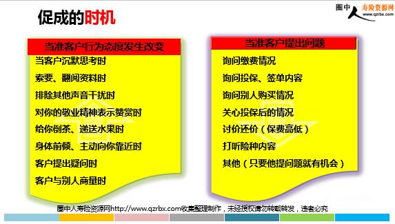 异议处理及促成 销售流程图回顾 包括两大环节主打产品解说促成及异议处理 正确看待客户的异议 面对销售行为的习惯性反射动作 对保险功用缺乏了解 不认为有迫切的需要 对客户经理缺乏信任 嫌货才是买货人购买从异议开始 目录 异议处理的类型 异议处理五步骤法 促成方法 思考 销售过程中遇到的异议有哪些? 已经买过了买保险不划算暂时不考虑 没钱不想买我有社保 …… 常见问题 不划算 已经有社保了买过了很健康,不着急想买了联系您和家人商量刚买房,没钱买保险 不如股票、基金、房产都要死了、病了才能赔不如放利息(放水)不相信 不相信公司,倒闭了怎么办?我找朋友买买时容易理赔难 不想买 客户异议的类型 异议处理五步骤法LSCPA 异议处理的常用句式 用心聆听(点头回应)是的是的,您说的很对。(建立同理心)理解尊重我理解您的想法,其实也有人这么说。(肯定-陈述)澄清事实除此之外,有没有其他的原因令您不考虑保险呢?但后来经过我们再次沟通后,发现这对他确实有所帮助,而且对我们双方都有好处。(陈述-转折)提出方案相信你也认同这个观点,不如让自己现在就拥有这份保障计划,面对人生风险时更加从容。尝试成交您看…(各种促成方法) 运用五步骤法处理不同类型的异议 1、不想买——没有钱 2、不划算——不如放利息(放水) 3、不相信——买时容易理赔难 LSCPA异议处理的注意事项 用心聆听、辨别真假察言观色、随机应变至少尝试三次以上!! 让客户认可自愿签下投保单 促成的心态准备 勇于促成的信心对保障方案的信心——保险没有买错的对公司的信心——历史最久、规模最大品牌最响、经营最稳对自己的信心——利他且利己营造轻松愉悦的促成氛围