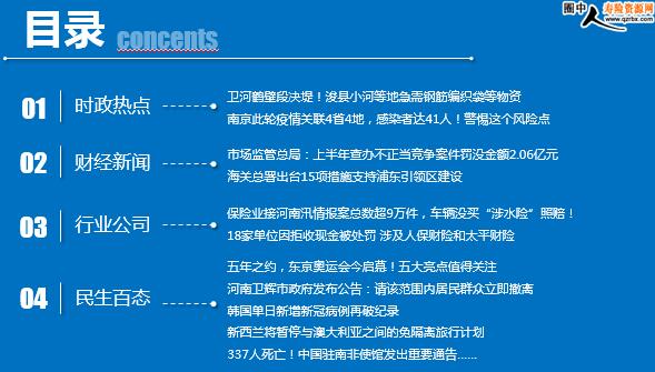 每日新闻速递 2021年7月24日 星期六 目录 时政热点 财经新闻 行业公司 民生百态 卫河鹤壁段决堤!浚县小河等地急需钢筋编织袋等物资 南京此轮疫情关联4省4地,感染者达41人!警惕这个风险点 市场监管总局:上半年查办不正当竞争案件罚没金额2.06亿元 海关总署出台15项措施支持浦东引领区建设 保险业接河南汛情报案总数超9万件,车辆没买“涉水险”照赔! 18家单位因拒收现金被处罚 涉及人保财险和太平财险 五年之约,东京奥运会今启幕!五大亮点值得关注 河南卫辉市政府发布公告:请该范围内居民群众立即撤离 韩国单日新增新冠病例再破纪录 新西兰将暂停与澳大利亚之间的免隔离旅行计划 337人死亡!中国驻南非使馆发出重要通告…… 时政热点 卫河鹤壁段决堤!浚县小河等地急需钢筋编织袋等物资 2021年07月23日 11:18 来源:环球经济报 7月23日上午,21世纪经济报道从当地居民处获悉,卫河鹤壁段已经决堤,有村民被围在河堤上。尽管填入了数车石头以及多辆大卡车,但仍未能堵住彭村的口子,目前侯村、寺南已经沦陷;今晨5点,临近卫河的浚县新镇泄洪,居民已被转移;目前下游的小河紧急需要钢筋以及焊工,希望焊成钢筋铁笼,用于堵决口。 值得注意的是,卫河以西不远处的共产主义渠也已漫堤,夹在两条河流之间的多个村庄情况危急。 南京此轮疫情关联4省4地,感染者达41人!警惕这个风险点 2021-07-23 07:30 来源:北京日报 南京市卫健委7月23日通报,7月22日0-24时,江苏新增本土确诊病例12例和7例本土无症状感染者。其中,南京当日新增本土确诊病例12例(其中5例轻型,7例普通型),新增无症状感染者6例,多数为禄口国际机场工作人员。此外,江苏省宿迁市也发现1例南京关联的无症状感染者。 截至22日24时,江苏省此轮疫情累计报告感染者38例,包括23例本土确诊病例和15例本土无症状感染者。7月22日至23日,广东中山、辽宁沈阳、安徽和县各报告了1例与南京关联的无症状感染者——至此南京此轮疫情已扩散至4省4地,感染者总计达41人。
