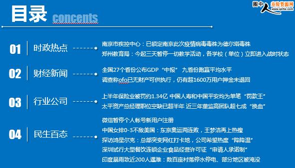每日新闻速递 2021年7月28日 星期三 目录 时政热点 财经新闻 行业公司 民生百态 南京市疾控中心:已锁定南京此次疫情病毒毒株为德尔塔毒株 郑州教育局:今起三天暂停一切教学活动,各学校(单位)立即进入战时状态 全国27个省份公布GDP“中报” 九省份跑赢平均水平 调查称ofo已无财产可供执行,仍有超1600万用户押金未退回 上半年保险业被罚约1.34亿 中国人寿和中国平安均为单笔“罚款王” 太平资产总经理职位空缺已超半年 近三年董监高团队超七成“换血” 微信暂停个人帐号新用户注册 中国女排0-3不敌美国:东京奥运两连败,王梦洁再上热搜 探访鸿星尔克:总部突变网红打卡地,公司希望热度“降降温” 深圳试行大型餐饮连锁企业食品经营许可证“申请人承诺制” 印度暴雨致近200人遇难:数百座村落停水停电、部分地区被淹没 时政热点 南京市疾控中心:已锁定南京此次疫情病毒毒株为德尔塔毒株 2021年07月27日 11:18 来源:中央 今天(27日)上午10时30分,南京市举行第七场新冠肺炎疫情防控新闻发布会,通报疫情防控最新情况。据南京市疾控中心副主任丁洁通报,从完成的病例来看,目前引起南京疫情的毒株是德尔塔毒株。德尔塔毒株目前是全球疫情流行的一个最主要的毒株。从此前相关的疫情来看,这个毒株有一些新的特点,它对身体的适应力增强,传播速度比较快,然后它这个病毒的载量比较高,治疗时间比较长,也比较容易发展成为重症。 郑州教育局:今起三天暂停一切教学活动,各学校(单位)立即进入战时状态 2021-07-27 07:30 来源:环球网 刚刚,郑州市教育局印发《关于做好台风暴雨防范工作的紧急通知》,要求各学校(单位)立即进入战时状态;所有校外培训机构全部暂停培训活动。27至29日三天,暂停一切教育教学活动。 根据气象部门7月26日发布的重要天气预报,受台风“烟花”外围云系影响,27日至29日郑州市有中雨,东部有大雨,局部暴雨。为做好此次台风暴雨的防范工作,郑州市教育局印发《关于做好台风暴雨防范工作的紧急通知》,要求各学校(单位)立即进入战时状态;所有校外培训机构全部暂停培训活动。